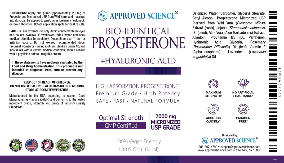 Approved Science Progesterone Cream - Bio-Identical, USP Grade - 20mg Serving - With Hyaluronic Acid