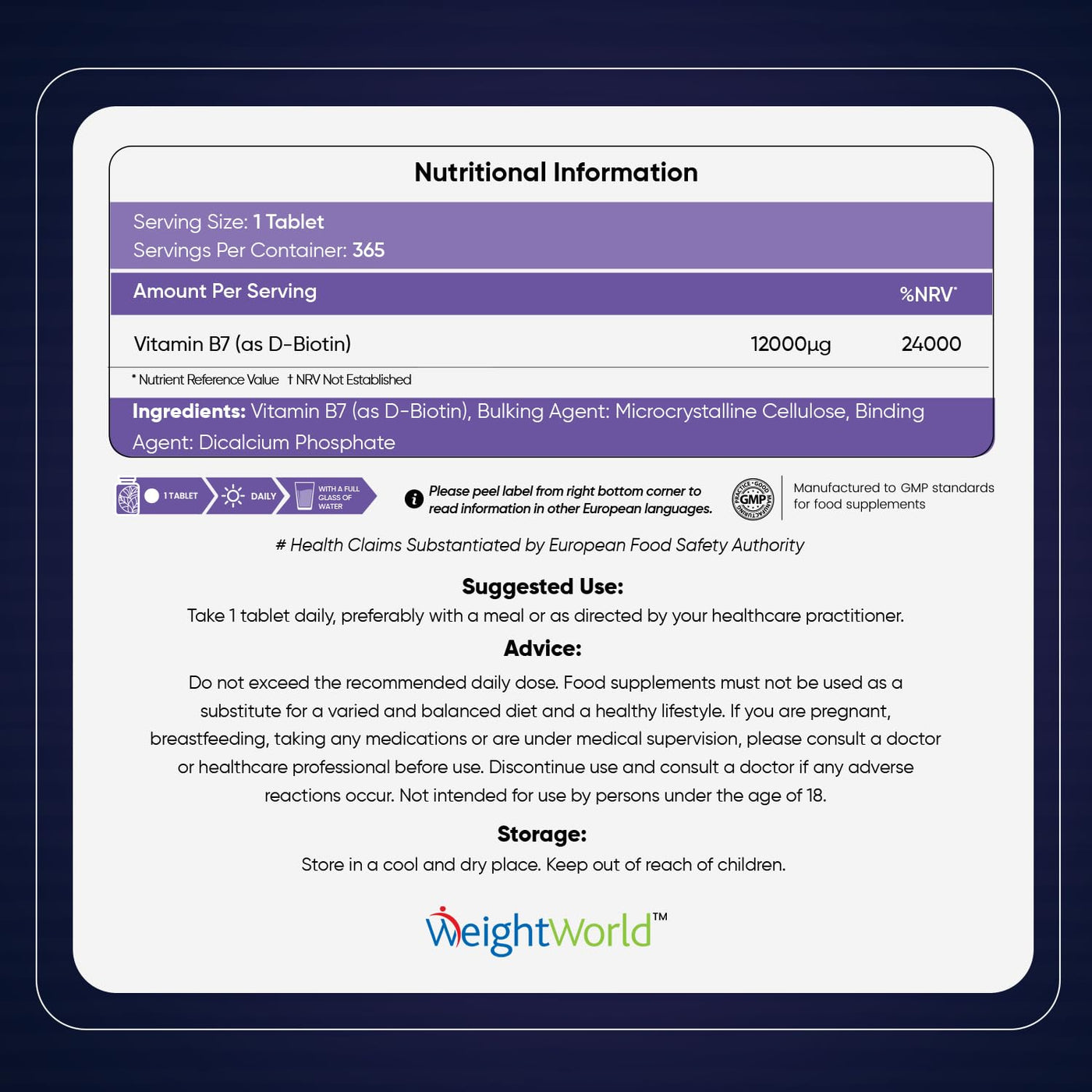 - 12000mcg BIOTIN TABLETS - 1 YEAR SUPPLY: Looking for an effective beauty supplement or hair growth tablets? Then, Our Biotin Hair Growth supplement is all you need. Each tablet of our high-strength biotin supplements serves Biotin 12000mcg (Vitamin B7) for incredible benefits. Each bottle contains 365 biotin tablets for hair & skin (not biotin gummies) that will replenish you for a year.