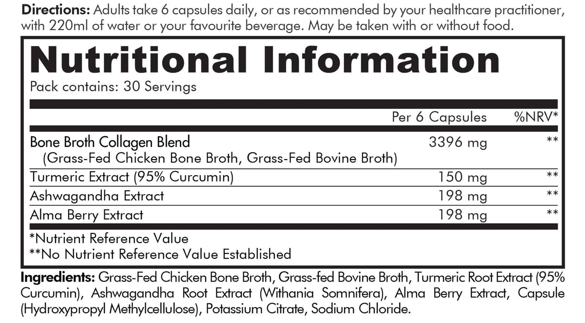 Organic Bone Broth Collagen Blend: Organic Chicken Bone Broth, Organic Bovine Bone Broth, Organic Turmeric Extract (95% curcumin), Organic Ashwagandha Extract (root and leaf), Organic Alma Berry Extract