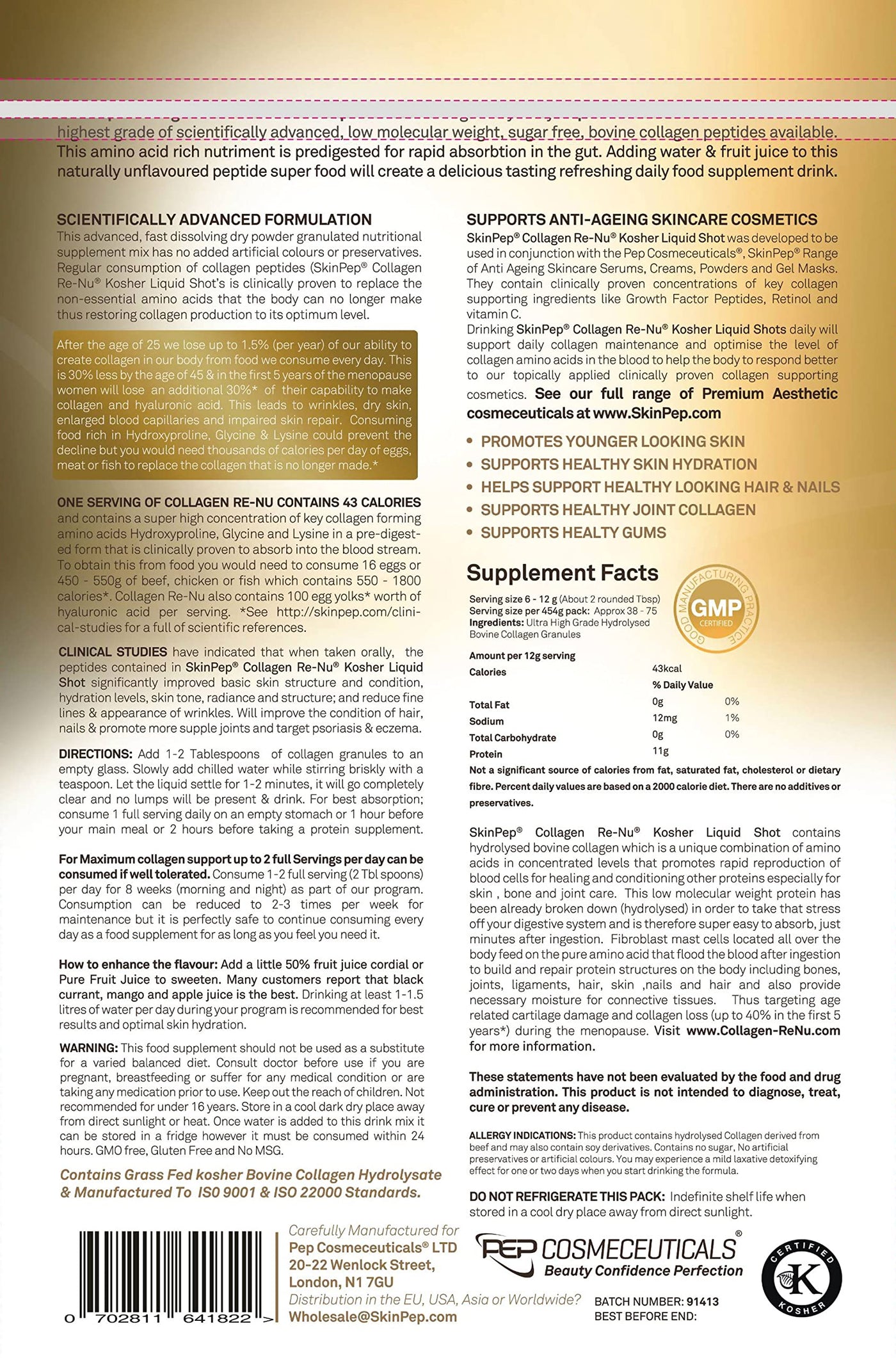- ✔ WHY SKINPEP PREMIUM GOLD HIGH QUALITY BOVINE COLLAGEN AGGLOMERATED GRANULES contain high-quality Collagen Peptides, from sustainable grass fed Italian herds, are primarily Type I&3 Collagen, mirroring that in bones and skin. Our Collagen is a bio-active hydrolysed form where the amino acids within, are broken down and absorbed better into the body. Each serving is low in calories at 36, each pouch provides 45 servings & It's suitable for Halal and Kosher diets