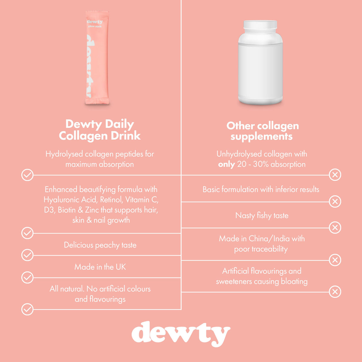 - Dewty: The Collagen Champion! Suitable for all skin types. Sachets packed with beauty benefits. Join the collagen revolution today!