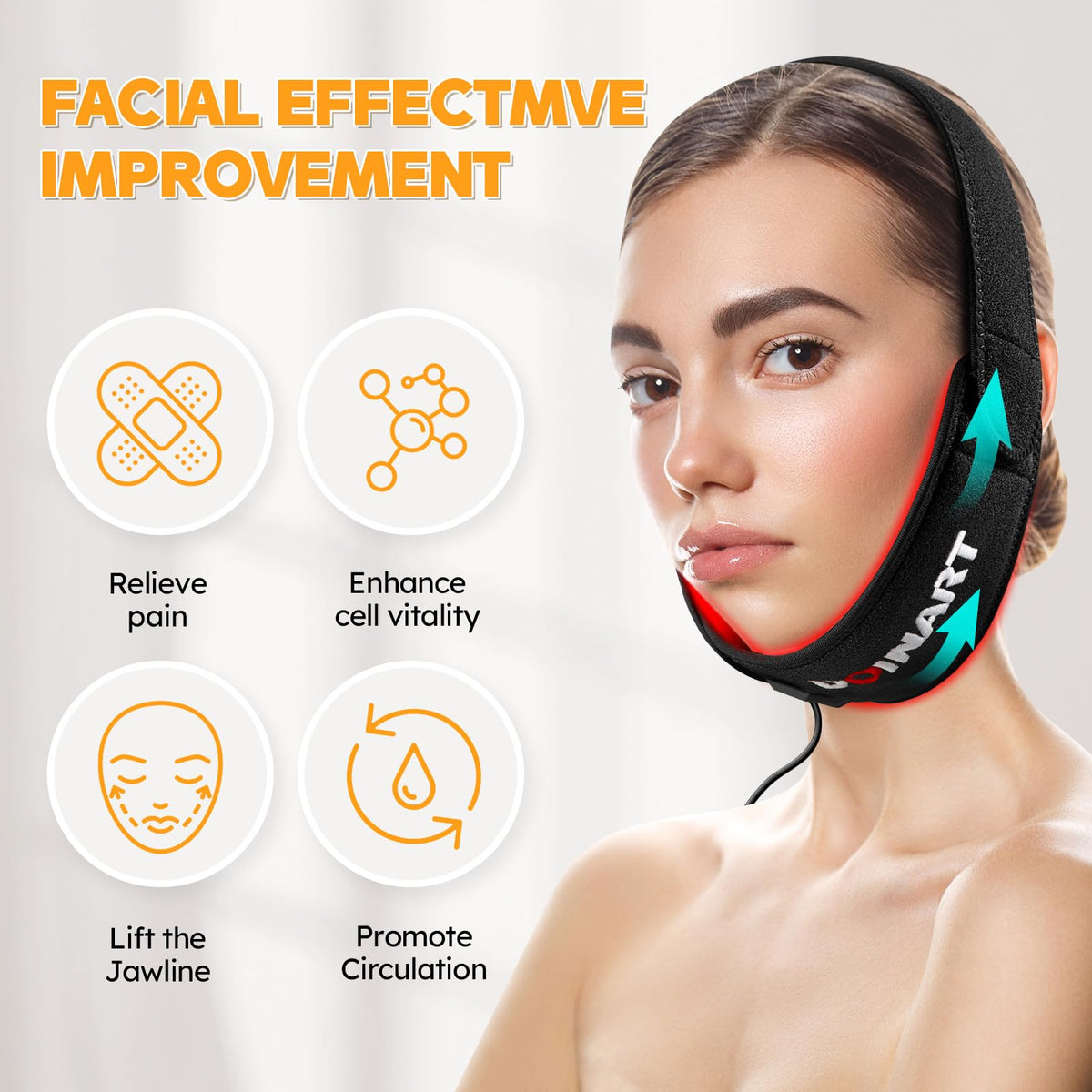 - Professional Infrared Red Light Therapy Chin Strap for Neck- 36pcs 660nm wavelengths red lights and 48pcs 850nm wavelengths near-infrared lights combo LED light therapy belt. As we all know, 660nm-red light is readily absorbed by surface tissues and cells to improve skin issues; 850nm-near infrared (NIR) light is invisible which penetrates into deeper tissues to enhanced recovery and aids in muscle performance and joint stiffness.