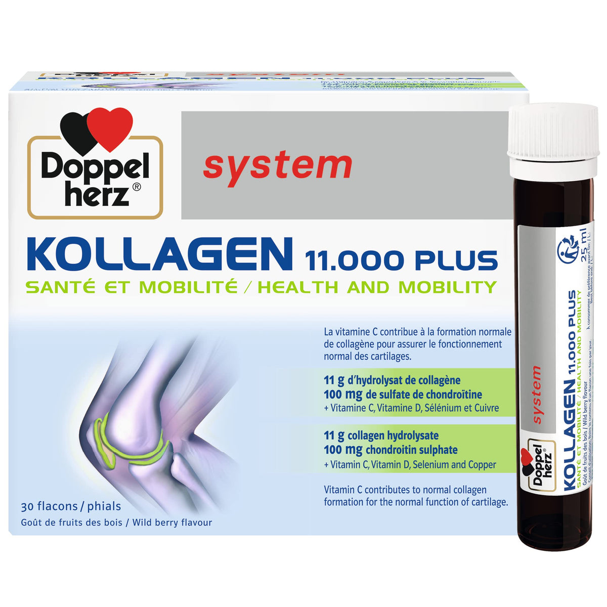 Doppelherz - Kollagen 11000 Plus - Collagen hydrolysate, chondroitin Sulphate, Vitamins C and D and Trace Elements - for Bones, cartilages and tendons - Wild Berry Flavour Liquid- 30 Bottles of 25ml