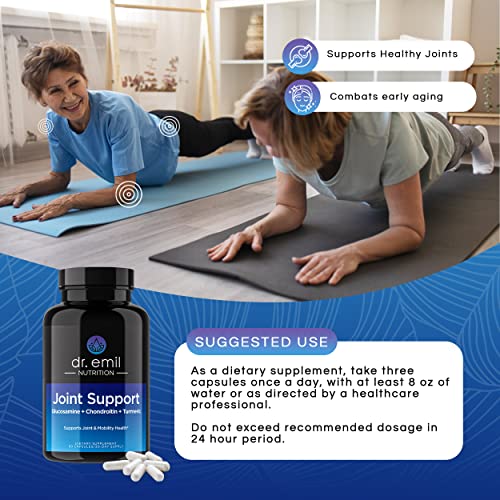 Details: ABOUT THE PRODUCT JOINT HEALTH, MOBILITY & PAIN RELIEF - The Dr. Emil joint support supplement uses an optimal blend of clinically proven, 100% natural ingredients to support overall joint health while aiding joint-related pain, stiffness and lack of mobility. Our arthritis supplements include ingredients shown to decrease and prevent cartilage deterioration, which is the leading cause of joint-related complications. In addition, we included potent anti-inflammatory herbs to aid pain and discomfort commonly associated with joint difficulties. PROTECTS JOINT CARTILAGE - The tried and true Glucosamine Chondroitin combination is supplemented with an optimal dosage of MSM, all of which have been clinically shown to reduce deterioration & protect cartilage. POWERFUL ANTI-IMFLAMMATORY - Enhanced with several potent herbs, including Turmeric & Boswellia, known to aid inflammation and swelling to further support joint mobility and pain relief.