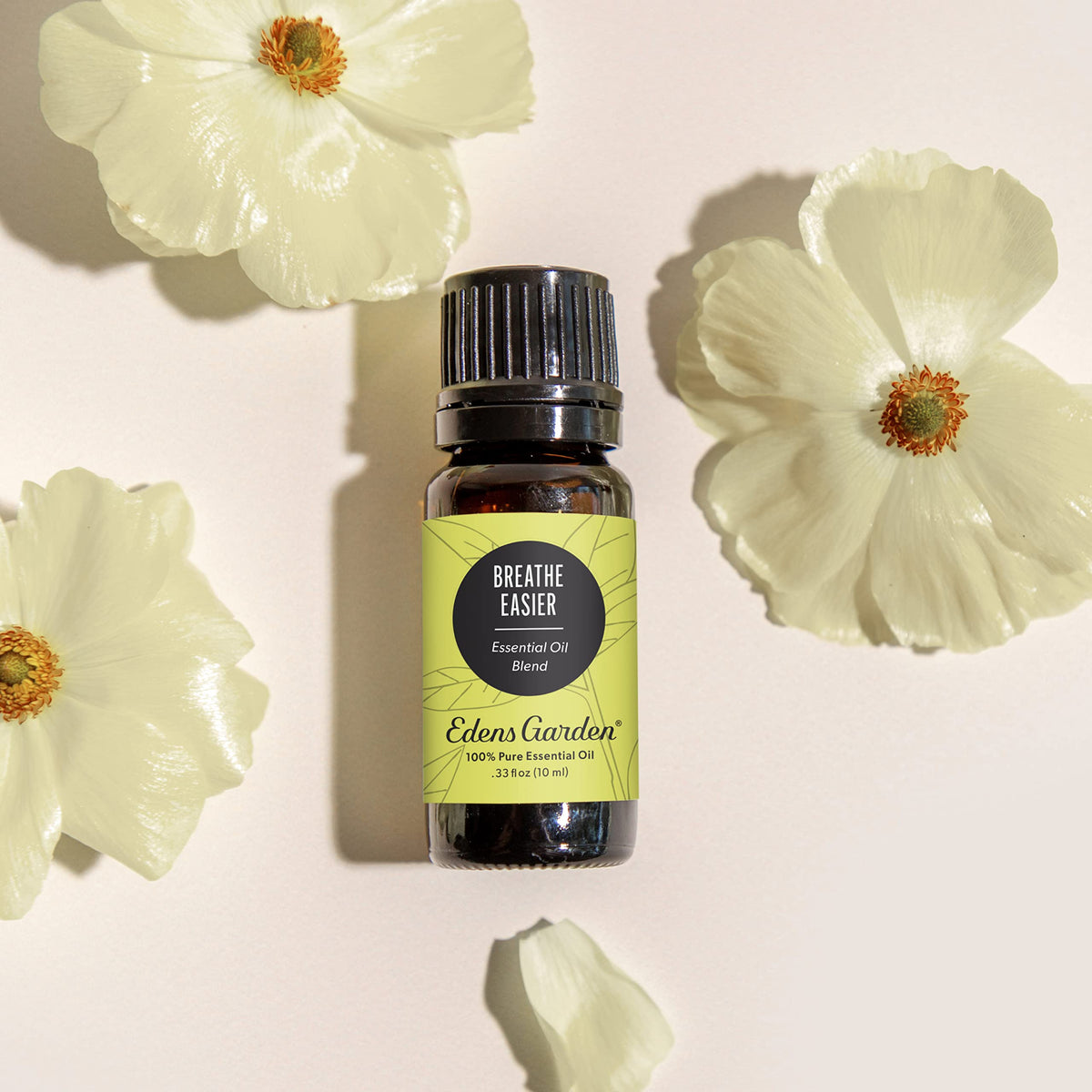 Details: Description: Whether it's allergy season or the cold is making its annual rounds, congestion and strained breathing typically arrives at lease once a year. If you're sick of cough syrup or just sick of being sick, try a natural approach with breathe easier. A restorative blend that actually helps promote circulation within the respiratory system, breathe easier can clear icky air passageways so you can effortlessly inhale and exhale. Its antiseptic qualities revitalize and soothe breathing. When you're sick in bed (or struggling in the elsewhere), breathe easier comforts with its warming and cooling effect while also strengthening the immune system. Although we cant promise that colds and coughs won't sneak up on you, breathe easier can simplify things. Breathe easier is a healing mixture of eucalyptus, lemon, peppermint and rosemary. Made with care from our top quality oils and, as always, edens garden essential oils are never diluted or mixed with additives. Contains: Eucalyptus, lemon, peppermint and rosemary be inspired: Itís a well-known truth that breathing calms the body and the mind. Improve your breath and reduce stress by inhaling breath easier in moments of tension. Or try placing a few drops breathe easier on a humidifier while you rest. You will wake with restorative breath, ready to breeze through the day.