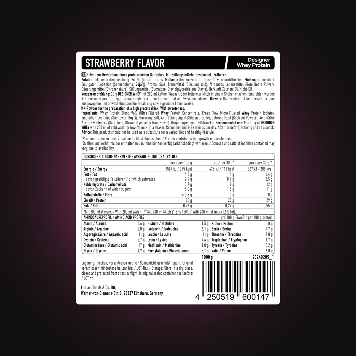 WHEY Protein Blend (Ultrafiltered WHEY Protein Concentrate, Cross Flow Microfiltered WHEY Protein Isolate), Flavor, Emulsifier (Lecithin (Sunflower, SOY)), Salt, Coloring Food (Beetroot Powder), Acid (Citric Acid), Sweeteners (Sucralose, Steviol Glycosides from Stevia).