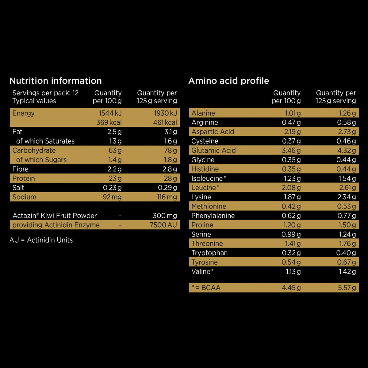 Details: Product description All Blacks Mass Gain Protein Blend A seriously strong protein powder designed to help you gain mass and muscle.* Mass Gain Protein contains a quality whey concentrate and isolate blend that provides 28g protein per serve. This formulation contains not only high protein, but high carbs too. Each serving provides 78g carbs, from a carbohydrate complex that includes Carb10, a balanced carbohydrate sourced from pea starch, in addition to maltodextrin and oat flour. Healthspan Elite have also added Actazin, a protease enzyme sourced from New Zealand kiwi fruit, to help break down protein into smaller peptides for better absorption in the body. What’s more, Mass Gain Protein Blend tastes great, with a natural chocolate flavour, and contains no artificial sweeteners – they use natural sweetener Stevia. Developed with the All Blacks With 25 years’ experience in nutrition, many leading athletes trust Healthspan Elite for their supplement needs – and what works for them, can work for you too. Healthspan Elite have partnered up with the All Blacks, taking advice from their nutritionist and the players themselves to deliver a winning range of proteins and supplements, made with the finest ingredients to help you stay healthy and perform to your best. A range you can trust This product has undergone rigorous testing by LGC’s world-class sports anti-doping laboratory, Sport and Specialised Analytical Services, for a wide range of substances banned by the World Anti-Doping Agency (WADA) to provide the highest levels of assurance possible for athletes. *Protein supports a growth in, and maintenance of, muscle mass. Ingredients Maltodextrin, Whey Protein Blend (Whey Protein Concentrate [Milk], Whey Protein Isolate [Milk], Sunflower Lecithin), Gluten Free Oat Flour, Carb10® (Pea Starch), Fat Reduced Cocoa Powder (4%), Thickener: Pregelatinised Corn Starch, Natural Flavouring, Actazin® Kiwi Fruit Prep. (Standardised Green Kiwi Fruit Powder, Ground Rice Hulls), Sodium Chloride, Sweetener: Steviol Glycosides. Directions Adults: Suggested serving size 125 g (approximately two level scoops) to achieve 28 g protein. Mix with 350 ml water or milk. Safety Warning Keep out of reach of children.