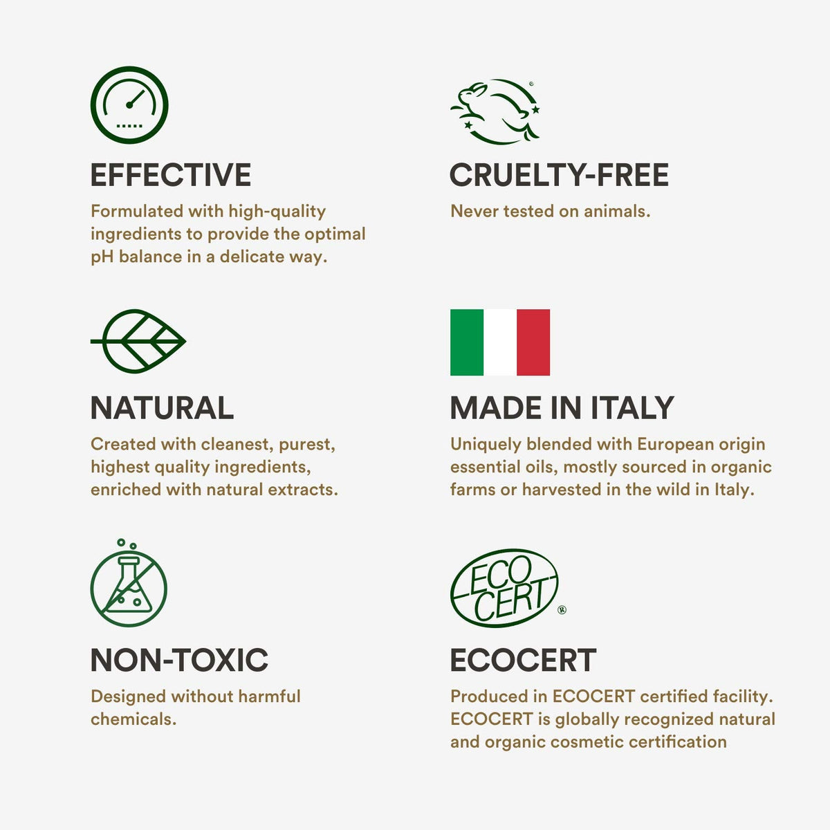 - CRUELTY-FREE – Made in Italy – Eco-Certified: Formulated with ingredients from ECOCERT and COSMOS certified organic farms.