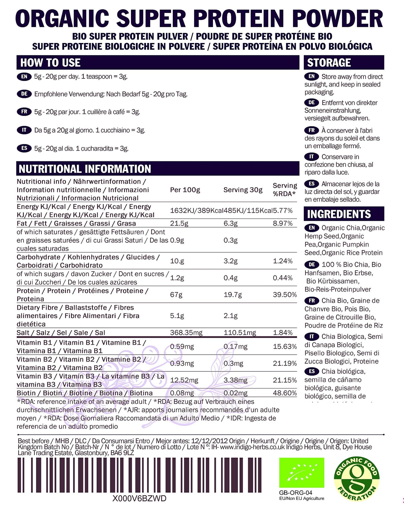Organic Super Protein is high in: Protein (65.8g per 100g), Dietary Fibre, Vitamin E, Vitamin B1, Vitamin B2, Vitamin B3, Vitamin B6, Folate, Biotin,