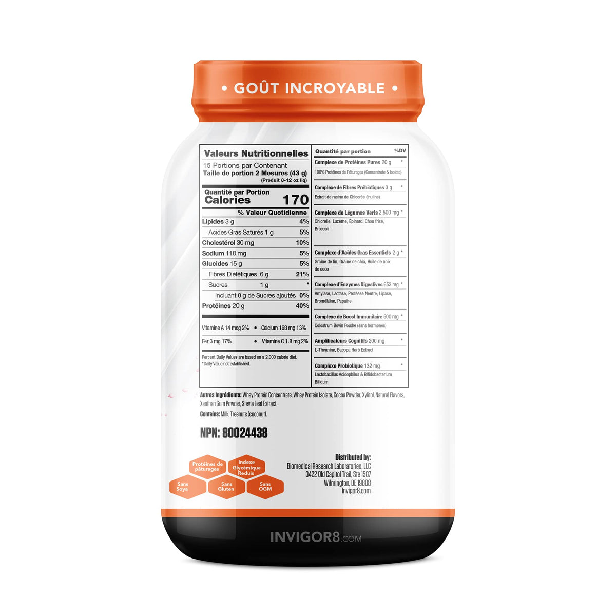 - INVIGOR8 SUPERFOOD SHAKE. Build lean muscle, stay satiated and promote healthy digestion. This delicious triple chocolate brownie shake gives you premium grass-fed whey protein, pre and probiotics, and immunity boosters for health from the inside out