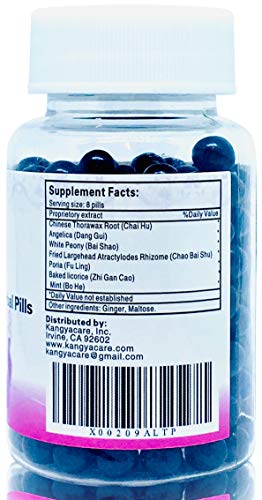 Details: 【Ingredients】 Chinese Thorawax Root (Bupleuri Radix), Angelica, White Peony, Fried Largehead Atractylodes Rhizome, Poria, Baked licorice, Mint. Other ingredients: Ginger, Maltose. 【Properties】 This product is a bright black concentrated pill; Smell is slight. Taste is sweet, spicy, and then bitter. 【Indications】 Dispersing stagnated liver and invigorating spleen, nourishing blood for regulating menstruation. For depression of liver-qi that causing irregular menstruation, discomfort and fullness in breast, dizziness, loss of appetite. 【Dosage】 Orally. 8 pills at a time, 3 times a day. 【Adverse reactions】 Currently unclear. 【Contraindication】 Currently unclear. 【Precautions】 Please read the instruction inside the package for more details. 【Storage】Sealed. 【Package】Packed in oral solid pharmaceutical polyester bottle, 200 pills per bottle. 【Validity Period】60 months.