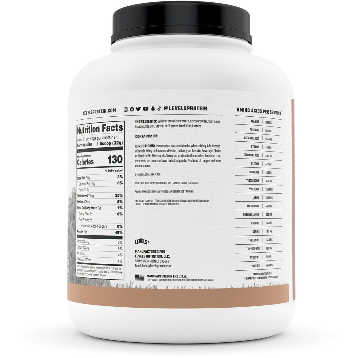 Details: Each scoop of our pure chocolate whey has 24g Protein, 5.4g BCAAs (branched-chain amino acids), and no added sugar. Customers choose Levels for a clean and pure way to build lean muscle, enhance fitness, lose weight and improve their overall health. Levels whey protein is made in the U.S.A. and goes through rigorous testing to meet the highest quality standards. Our paleo and keto friendly whey is gluten free, soy free, antibiotic free, rGBH/rBST hormone free, and contains no artificial flavors, no so-called "natural flavors", no artificial sweeteners and no GMOs. Our 100% grass-fed whey protein comes from pasture raised U.S. Dairy Cows. Grass fed animals eat a nutrient rich, diverse diet of pasture, which creates a higher concentration of vitamins, minerals, and other beneficial nutrients. Additionally, there is no assurance that a 100% organic animal did not live the majority of its life in a confined space. Humanely treated grass-fed cows live healthier, more natural lives, but they also place less stress on the land they inhabit. When properly managed, grass-fed animals can produce a net benefit to the environment. Pasture grazing requires significantly less fossil fuel than a feedlot diet consisting of corn, soy, antibiotics, and hormones. Pastured animals fertilize the land they graze on, which eliminates the fossil fuels required by conventional fertilizing practices. Lastly, grass-filled fields not only hold on to topsoil and moisture, but also more effectively remove carbon dioxide from the atmosphere than any other use of land. Levels pure chocolate whey is the first of its kind in protein. We broke norms by selecting ingredients sourced from farmers certified in best practices to create whey from grass-fed dairy. We then combine our whey with delicious 100% pure cold-pressed cacao and lightly sweeten it with monk fruit. No other whey compares to this remarkably delicious, nutrient-dense combination of protein, vitamins and minerals.