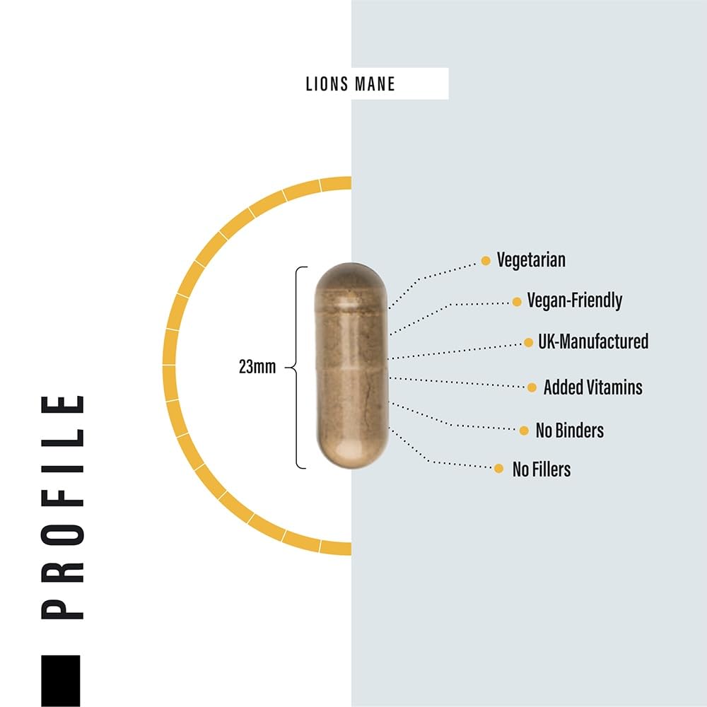 Lion's Mane Extract 20:1 (50% Polysaccharides), Vitamin B3 (Niacin), Black Pepper Powder, Vitamin B6 (Pyridoxine), Vitamin B1 (Thiamine), Vitamin D3 (Cholecalciferol from Algae), Vitamin B12 (Methylcobalamin), Vegetable Capsule Shell (HydroxyPropylMethylCellulose).