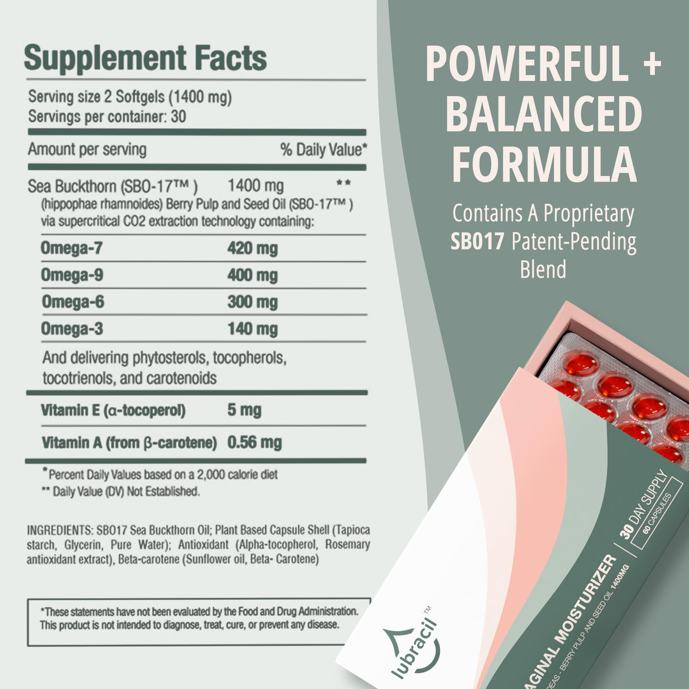 - UNIQUE HYDRATION FORMULA – Lubracil's Vaginal Moisturizer Capsule Gel, enriched with our proprietary SB017 blend and a comprehensive supply, ensures long-term ease from vaginal dryness. This meticulously crafted mix, including Sea Buckthorn, Omega 6, 7, & 9, Vitamin A, & E, provides deep moisturization for daily comfort and well-being.