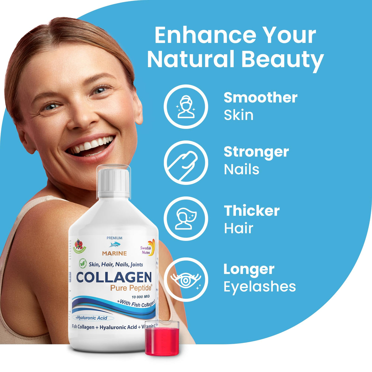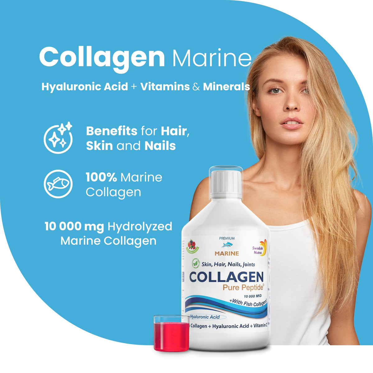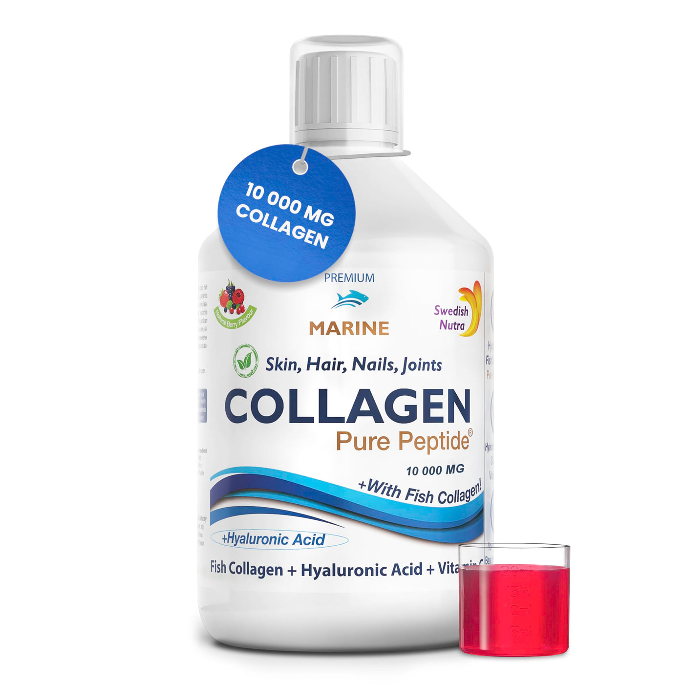 - SWEDISH NUTRA MARINE COLLAGEN IS THE NEXT LEVEL IN MODERN DAY SCIENCE . We lose 1-2% of our collagen consistently after age 30, which is when physical maturing becomes noticeable. Swedish Nutra Marine Liquid Collagen is a supplement that contains special types of proteins that can dramatically improve your hair, skin and nails.