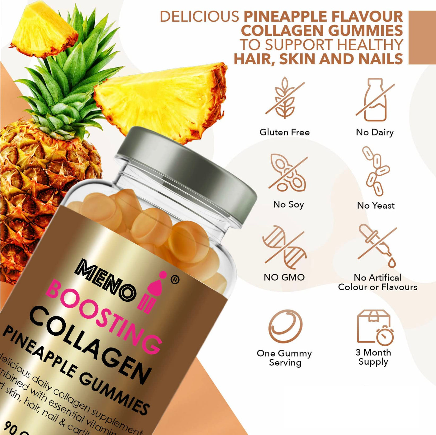 Meno BOOSTING Collagen Pineapple Gummies - (90 gummies for a up to 3 month supply) Yummy natural Pineapple flavour 500mg Bovine Collagen Vitamin A Biotin Vitamin E Vitamin C Selenium Up to 3 month supply Hair, Skin, Nails and Cartilage Natural flavours and colours Gluten, Diary and Soy FREE When should you start taking collagen? Research suggests that the best time to start taking collagen is much earlier than we think. The body's natural collagen production starts to decrease more noticeably around our late twenties, so there could be benefits to getting a head start on boosting the body's collagen levels. However, the good news is there are still many advantages from taking collagen at any age. Collagen thankfully also has a great safety profile and isn't associated with adverse side effects. On top of this, a daily dose of collagen can also help boost your protein intake which is a key macronutrient needed in our later years to help improve our overall health. Meno BOOSTING Collagen 90 Natural Pineapple Flavour Gummies - a daily collagen supplement blended with essential vitamins to support skin, hair, nail, and cartilage health. Meno BOOSTING Collagen gummies are presented in a delicious natural pineapple flavour and provide 500mg of collagen per one gummy serving, combined with Biotin, Selenium, and vitamins A, C, and E. Vitamin C is an essential nutrient and contributes to the healthy function of blood vessels, cartilage, gums, bones, teeth, and skin. Vitamin C also contributes to normal collagen formation, making it highly synergistic in this formula. From the age of 25, our body's ability to rebuild collagen level dissipates. Troo Collagen gummies provide a convenient daily supplement to replenish your collagen stores. Using Bovine hydrolysed collagen means the collagen molecules are small enough to get to where they are needed most when ingested (high bioavailability).