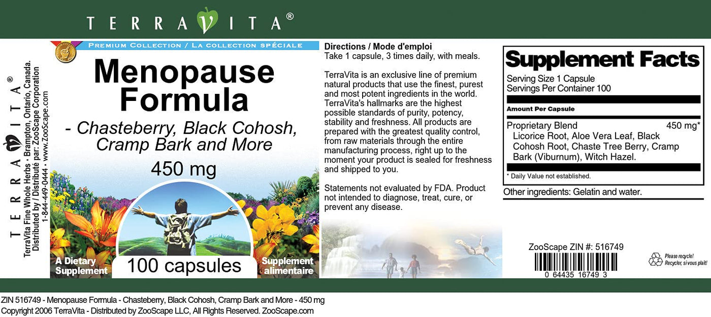Menopause Formula - Chasteberry, Black Cohosh, Cramp Bark and More - 450 mg (100 Capsules)