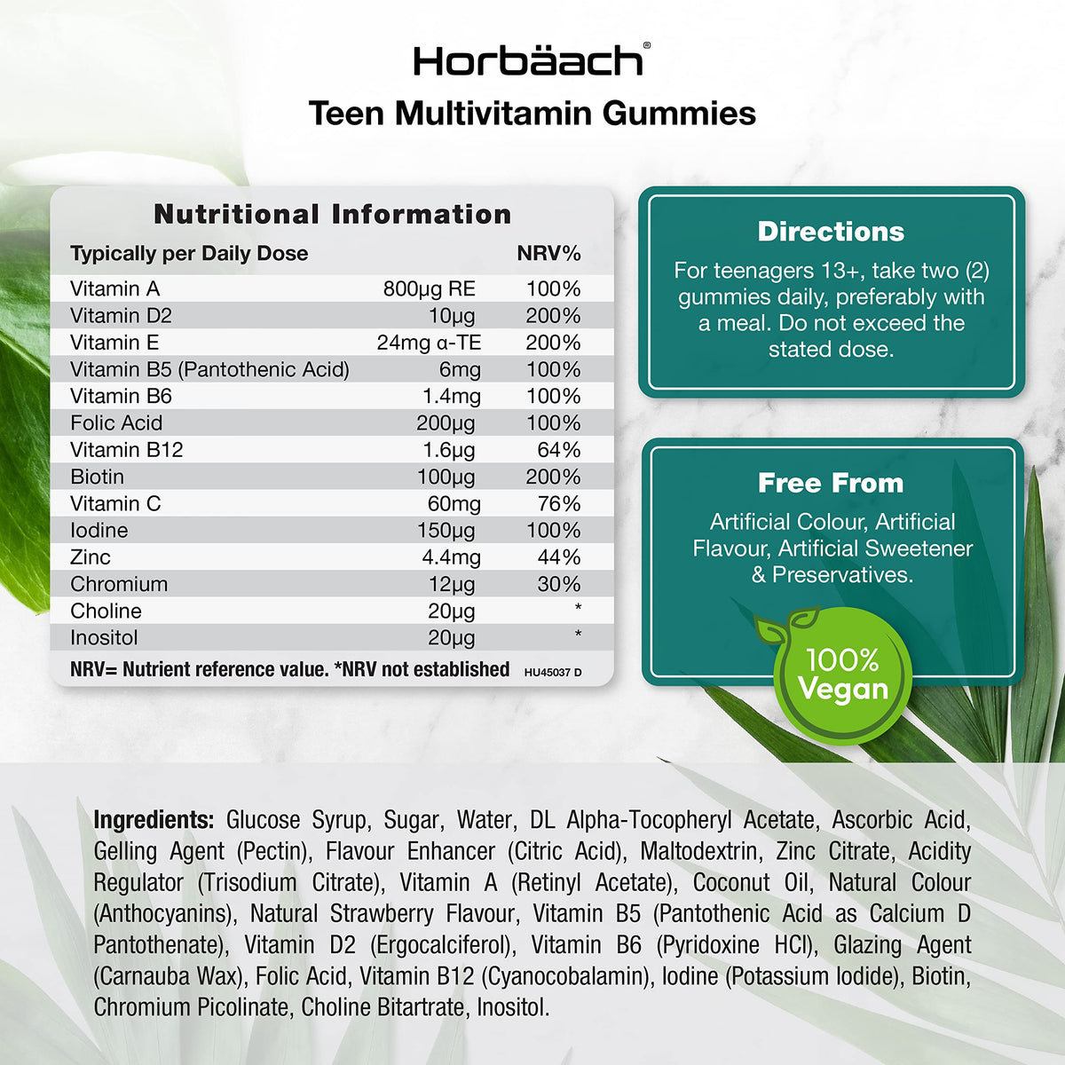 - SUITABLE FOR: Horbaach Multivitamin gummies are vegan and vegetarian friendly, and contain no artificial colours, preservatives or sweetner. It's the perfect formula for teen boys and girls at the best value.