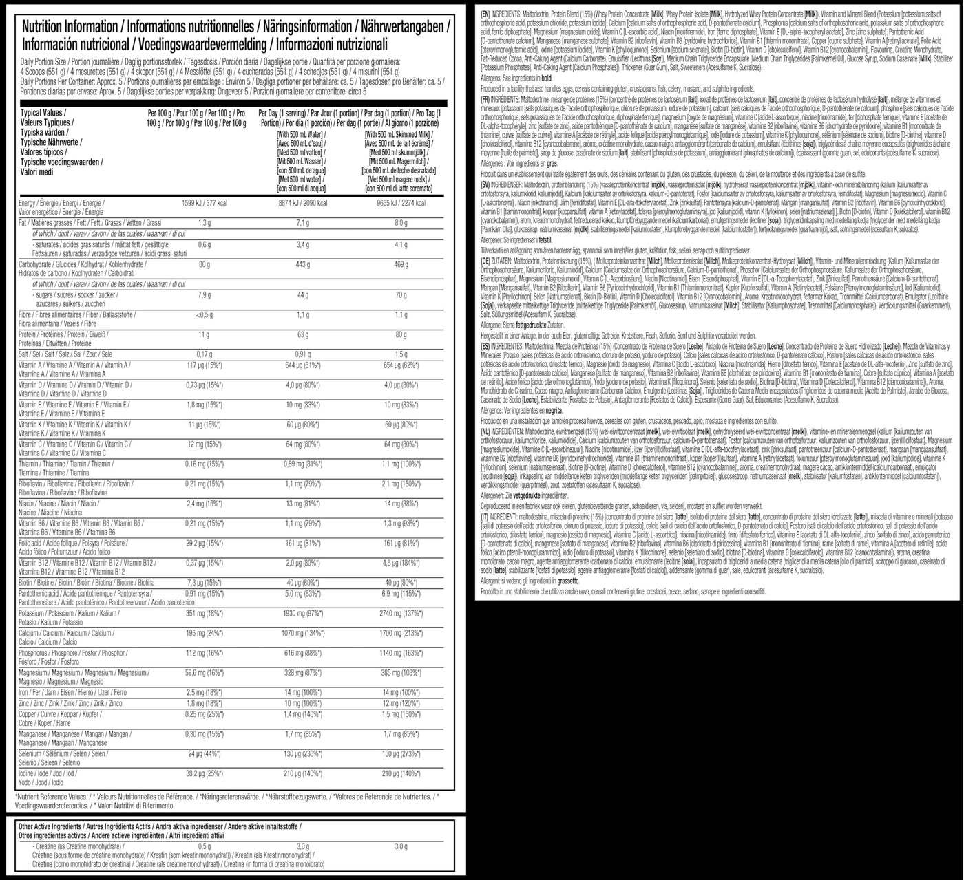 INGREDIENTS: Maltodextrin, Protein Blend (15%) (Whey Protein Concentrate [Milk], Whey Protein Isolate [Milk], Hydrolyzed Whey Protein Concentrate [Milk]), Vitamin and Mineral Blend (Potassium [potassium salts of orthophosphoric acid, potassium chloride, potassium iodide], Calcium [calcium salts of orthophosphoric acid, D-pantothenate calcium], Phosphorus [calcium salts of orthophosphoric acid, potassium salts of orthophosphoric acid, ferric diphosphate], Magnesium [magnesium oxide], Vitamin C [L-ascorbic acid], Niacin [nicotinamide], Iron [ferric diphosphate], Vitamin E [DL-alphatocopheryl acetate], Zinc [zinc sulphate], Pantothenic Acid [D-pantothenate calcium], Manganese [manganese sulphate], Vitamin B2 [riboflavin], Vitamin B6 [pyridoxine hydrochloride], Vitamin B1 [thiamin mononitrate], Copper [cupric sulphate], Vitamin A [retinyl acetate], Folic Acid [pteroylmonoglutamic acid], Iodine [potassium iodide], Vitamin K [phylloquinone], Selenium [sodium selenate], Biotin [D-biotin], Vitamin D [cholecalciferol], Vitamin B12 [cyanocobalamin]), Flavouring, Creatine Monohydrate, Fat-Reduced Cocoa, Anti-Caking Agent (Calcium Carbonate), Emulsifier (Lecithins [Soy]), Medium Chain Triglyceride Encapsulate (Medium Chain Triglycerides [Palmkernel Oil], Glucose Syrup, Sodium Caseinate [Milk], Stabilizer [Potassium Phosphates], Anti-Caking Agent [Calcium Phosphates]), Thickener (Guar Gum), Salt, Sweeteners (Acesulfame K, Sucralose). Allergens: See ingredients in bold.