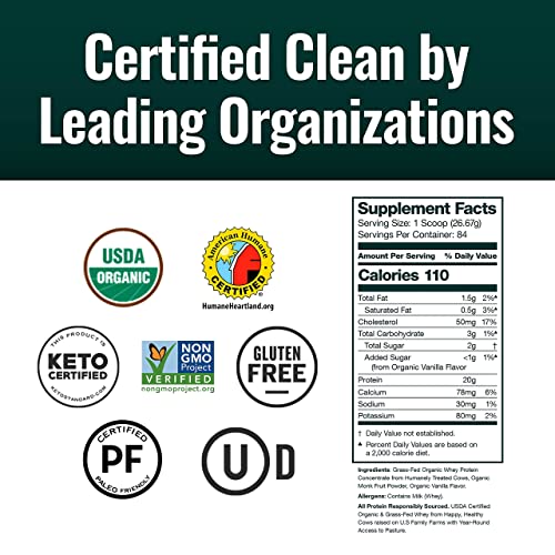 Features and Benefits of Organic Whey Protein: 20 grams complete protein, 3g total carbs, and only 110 calories per serving. Ideal source of essential amino acids and BCAAs. Light, clean flavor perfect for smoothies and shakes. Stevia free and sweetened only with organic monk fruit. Made from 100% organic ingredients and lab tested for quality and purity.