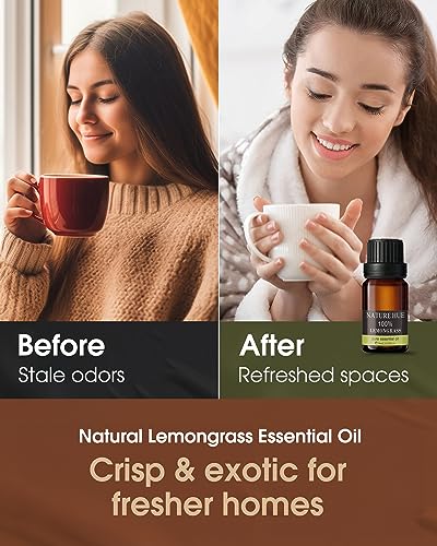 - 【Pure and Natural Lemongrass Oil】: Nature Hue Lemongrass Essential Oil is steam distilled from the leaves and stems of fresh lemongrass. It has a fresh and lemony scent that can make you feel refreshed and energized. You can enjoy this oil in aromatherapy, by diffusing it or inhaling it directly from the bottle. You can also blend it with other essential oils, such as lavender or peppermint, to create your own custom scent.