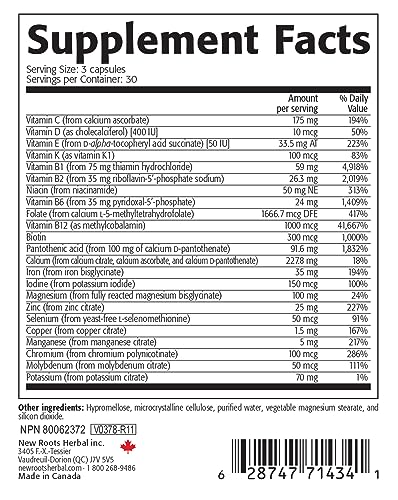 NEW ROOTS HERBAL Prenatal Complete MultiVitamin (90 Veg Caps) - with Biotin, Iron & Folate