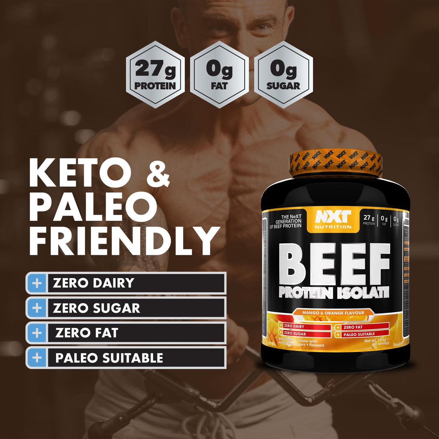 Great-Tasting & Effective, Beef Protein Powder Isolate NXT Nutrition is one of the UKs best selling pure beef protein supplements of the highest quality and proudly made in the UK. Beef Protein Isolate unwanted fat or cholesterol. For those who are lactose intolerant this product is a lifesaver NXT Beef Protein, Great for Keto, Paleo and Low Carb Diets The amino acids in protein are the building blocks of muscle protein synthesis. Consumed before or after exercise it helps kick-start the recovery process. With 7 incredible flavours to choose from, NXT Nutrition gives you plenty of ways to keep workout recovery tasty and enjoyable. Post workout beef protein slushies anyone? Feed your muscles properly with this beef protein powder isolate, a natural and clean muscle gainer featuring Keto, Paleo and low carb ingredients. Features & Benefits 7 unique fruity flavours that mix easily into water or juice Ideal if you are lactose intolerant Dairy and gluten-free The ultimate alternative to whey and other dairy proteins 27g of a complete protein powder per serving Perfect diet protein powder for weight loss Delicious and refreshing fruity flavours including strawberry lime, cola, blue raspberry, apple, orange, pineapple, kiwi lime, this is genuinely one of the best tasting protein shakes you’ll ever try.