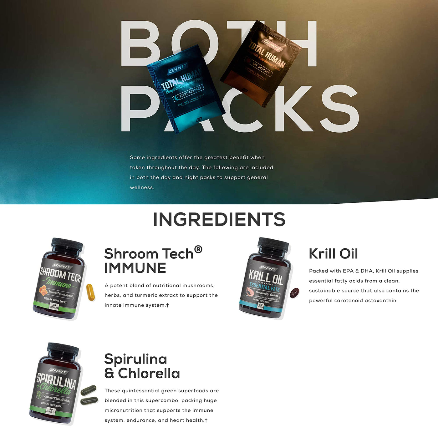- Support General Wellness: Featuring ingredients that offer the greatest benefit when taken throughout the day, the Day and Night daily multivitamin packs include Shroom Tech immune support, Krill Oil, Spirulina, and Chlorella for endurance.