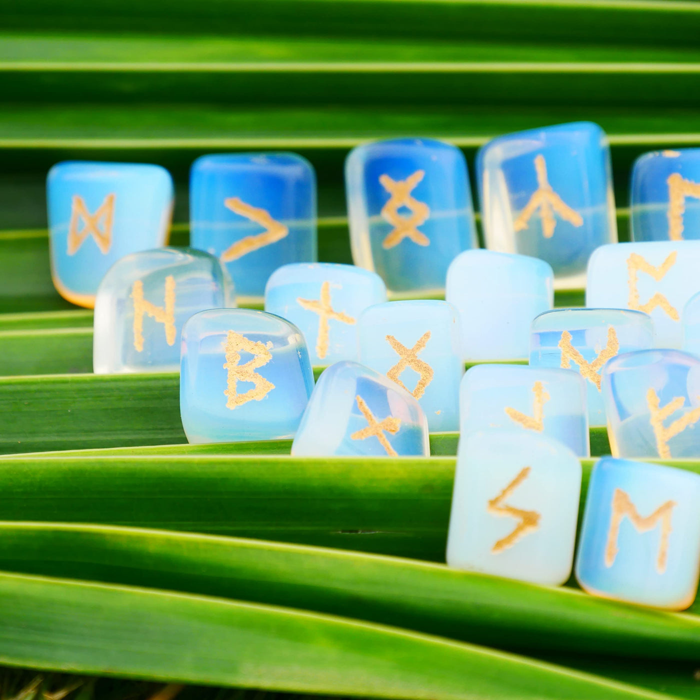 Opalite Rune Stone - Rune Set - Engraved Elder Futhark Alphabet Symbols - Witchcraft Crystals