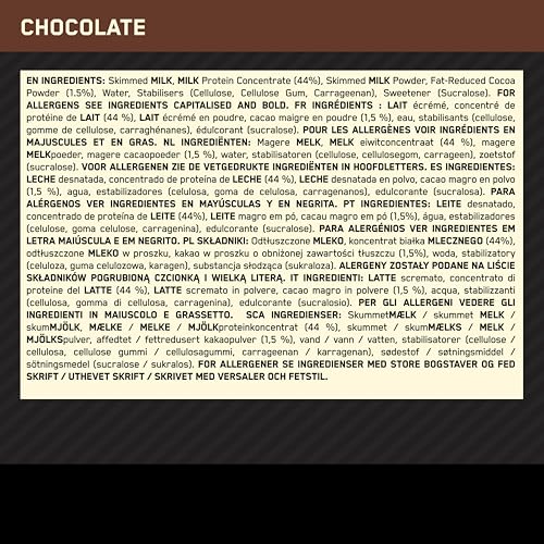 EN: INGREDIENTS: Skimmed MILK (75%), water, MILK protein concentrate (8.6%), fat-reduced cocoa powder (1%), flavouring, acidity regulator (trisodium citrate), stabilisers (gellan gum, carrageenan), sweetener (sucralose).