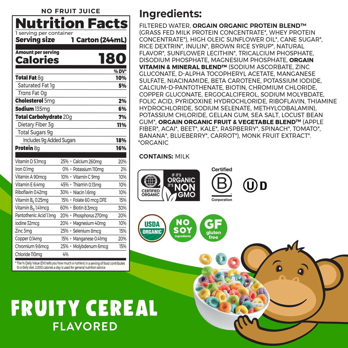 Orgain Organic Kids Nutritional Protein Shake, Fruity Cereal - Kids Snacks with 8g Dairy