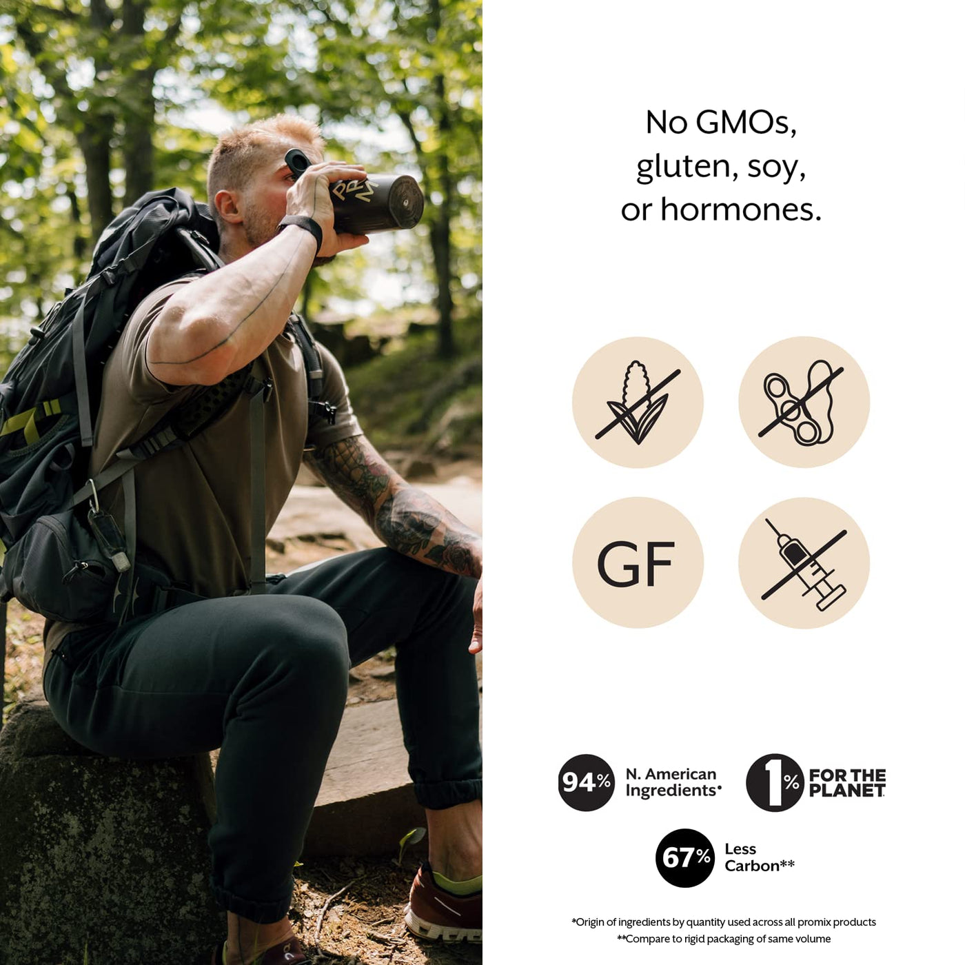 - Seriously Clean: Whey Protein Powder is made without casein. All Promix products are free of gluten, soy, GMOs, hormones, antibiotics, refined sugar, artificial sweeteners, stevia, gums, fillers, and bleach. 94% of ingredients sourced from North America. Partner of 1% for the Planet. Produced in facilities using GMP (Good Manufacturing Practice) standards.