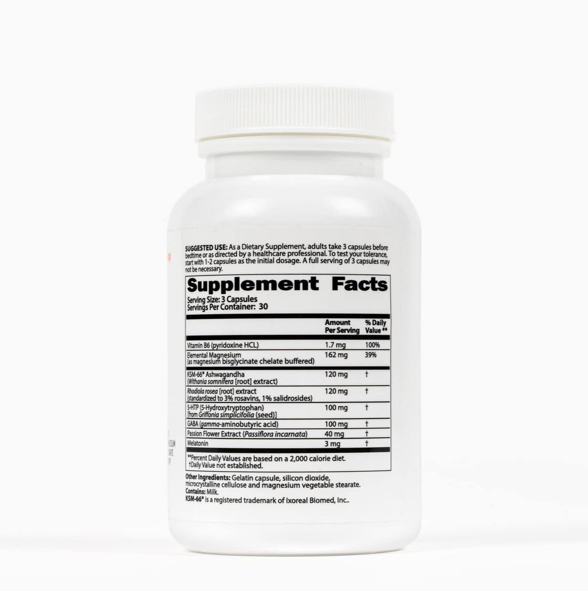 Magnesium Glycinate (18% Magnesium), Rhodiola Rosea 4% (Salidrosides 3% Rosavins), Organic Ashwagandha Root Powder (Withania Somnifera), Vitamin B6 (Pyridoxine HCL), 5-HTP (5-Hydroxytryptophan), GABA (Gamma Aminobutyric Acid), Passion Flower Extract 4%, Melatonin.