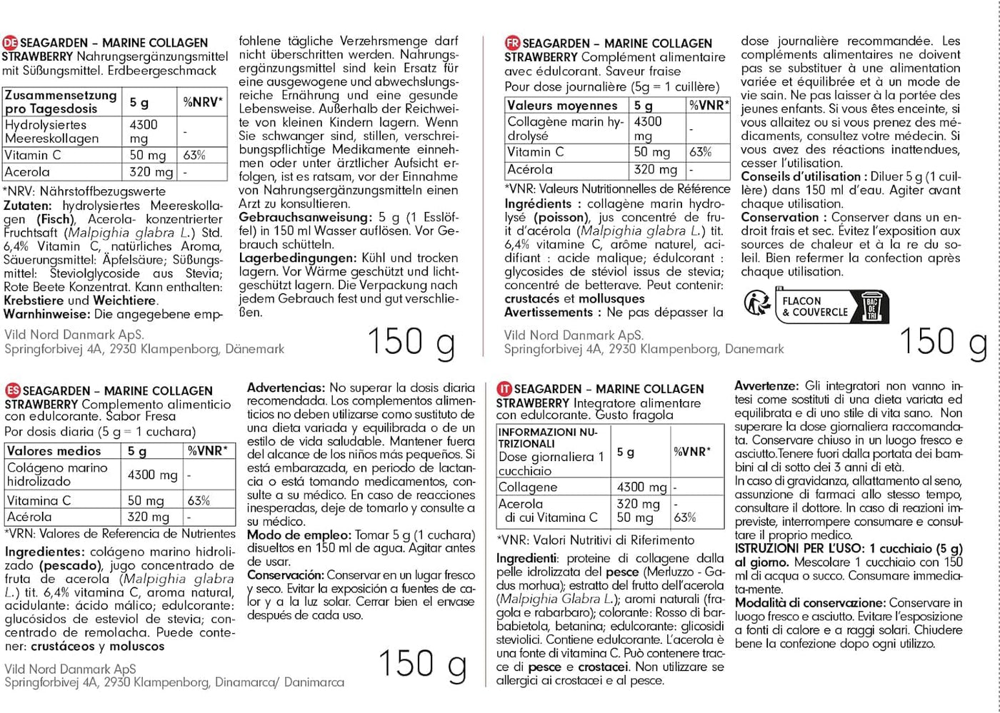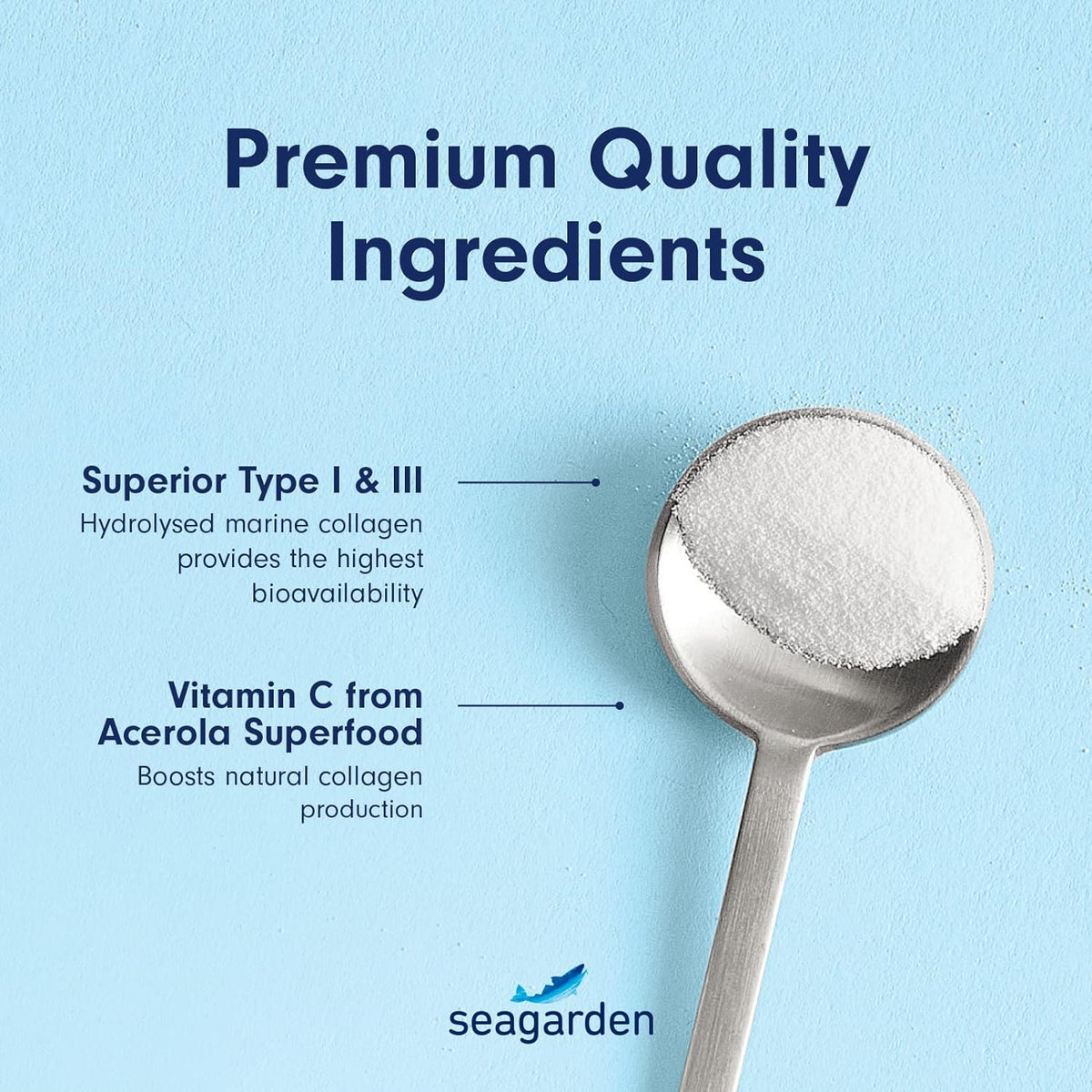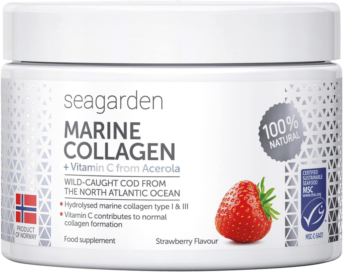 - COLLAGEN SUPPLEMENTS WITH VITAMIN C: Seagarden hydrolyzed collagen powder with natural strawberry flavor is added with natural vitamin C from acerola fruit. Vitamin C promotes the formation of collagen and helps protect cells against oxidative stress. Easy to use. Add 5 g (1 tbsp) of warm or cold drinks, shakes and more for daily collagen boost.