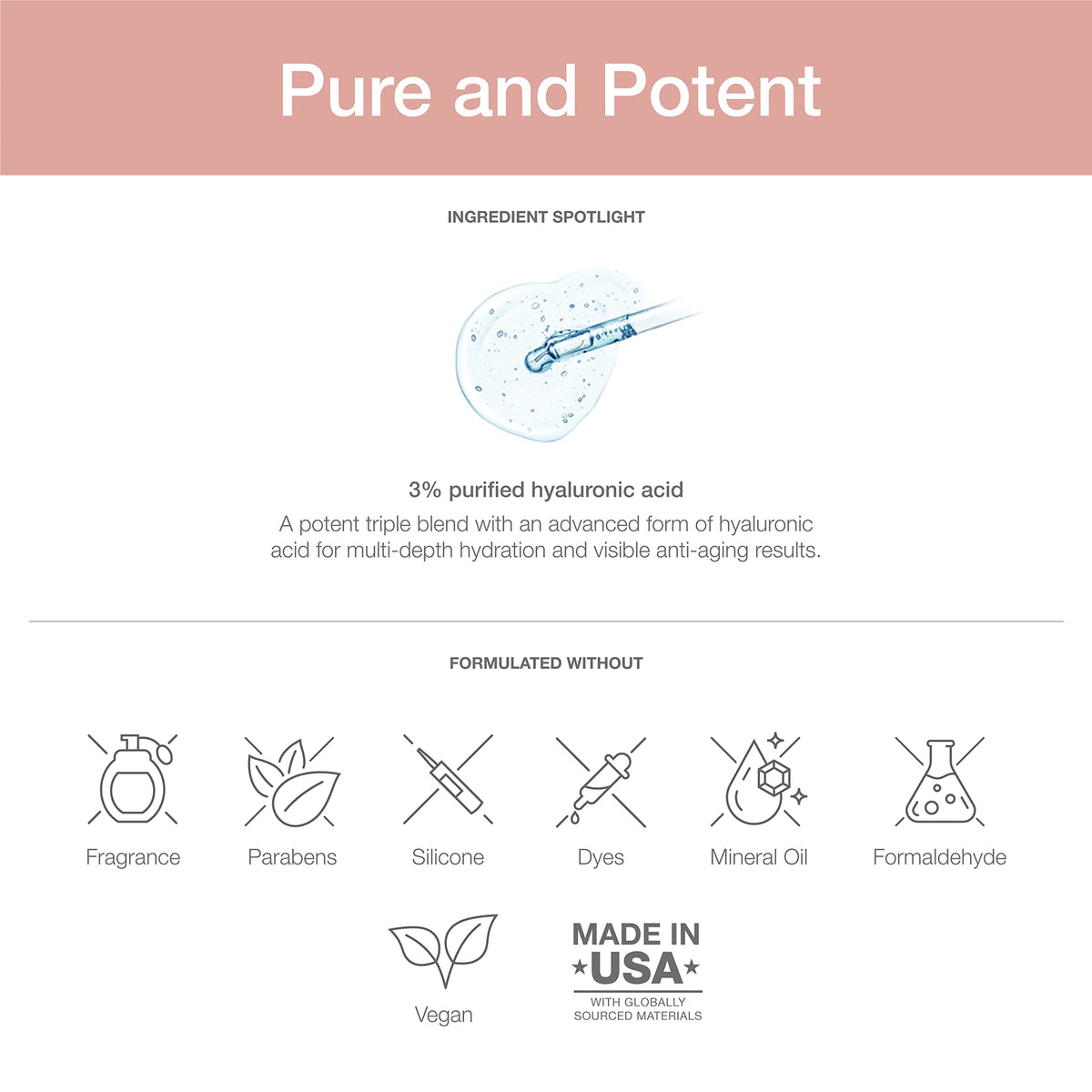 - MULTI-LEVEL EFFECTS – Our hyaluronic acid serum is pure and potent and consists of 3 forms of hyaluronic acid with varied molecular weights. Lower weights allow the hyaluronic acid to penetrate deep into the epidermis to noticeably hydrate, plump, and firm skin, while the higher weight targets the skin surface, sealing in the effects.