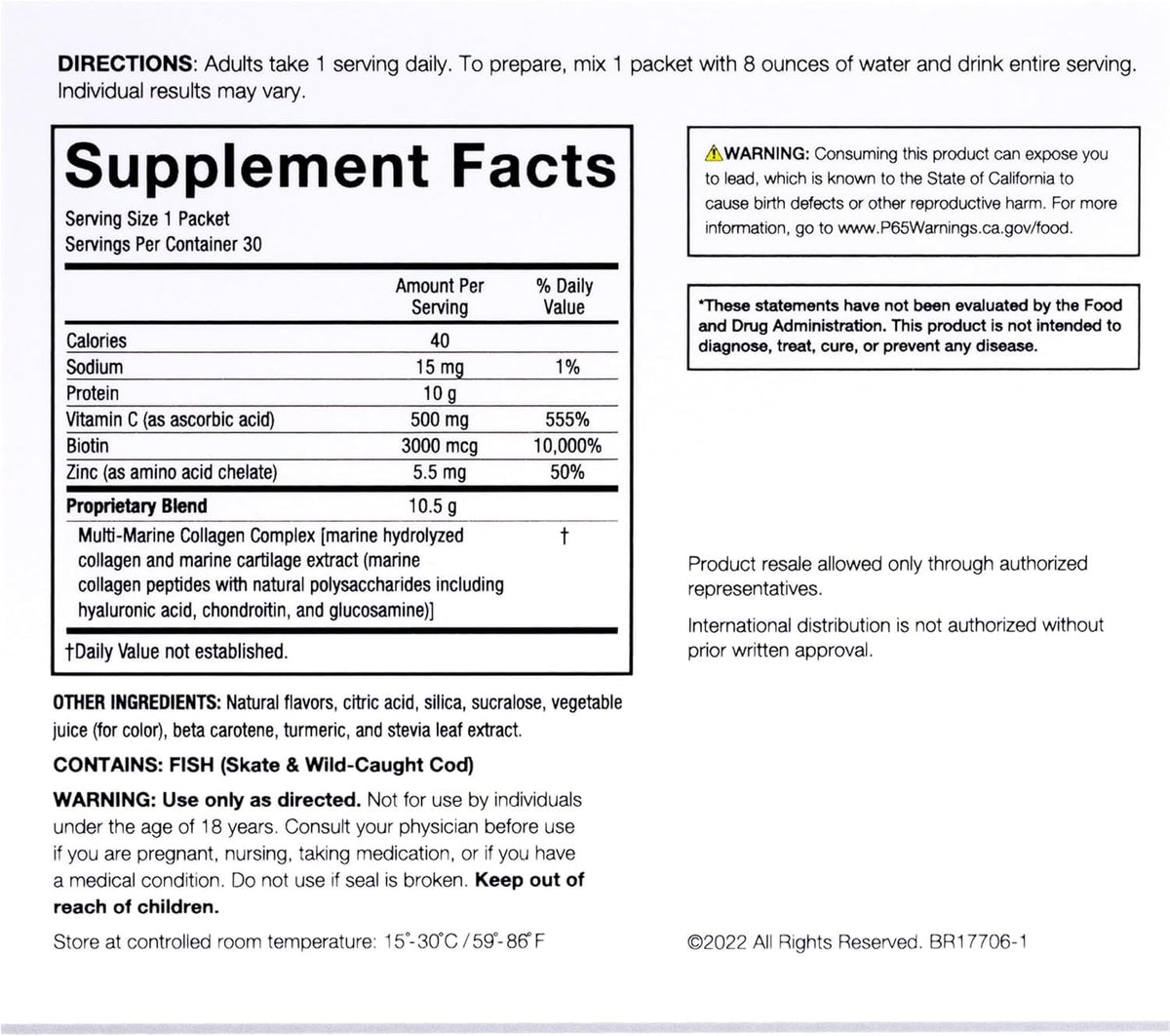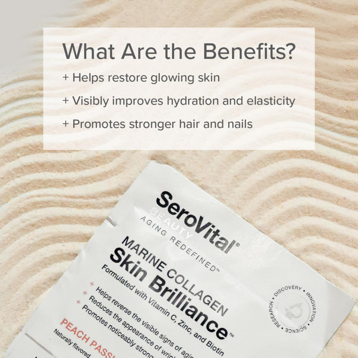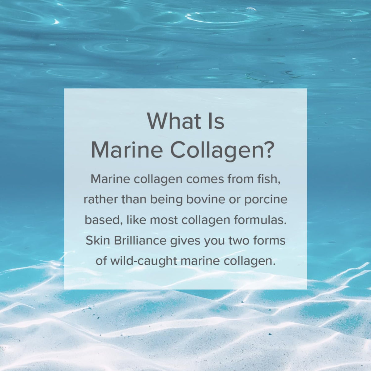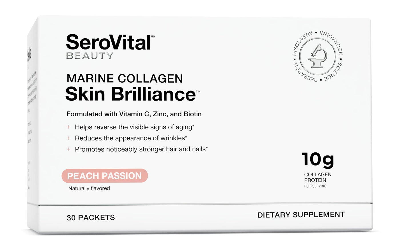 Details: As you age, your body produces less collagen, and the quality of that collagen diminishes. Skin Brilliance helps replenish your skin from the inside out with two forms of marine collagen plus a biotin, vitamin C, and zinc blend. Help reverse the visible signs of aging with Skin Brilliance.* + Helps reverse the visible signs of aging*+ Reduces the appearance of wrinkles*+ Promotes stronger hair and nails*+ Provides antioxidant support*+ Improves skin elasticity* + Increases skin thickness*A Delicious, Two-Part FormulaThis peach-passion flavored powder gives you an inside-out approach to addressing the loss of elasticity, wrinkles, and sagging skin that come with our body’s naturally declining collagen levels. It includes a full 10 grams of collagen, plus a biotin, vitamin C, and zinc blend for additional skin-rejuvenating results.*This collagen is unique. Rather than bovine or porcine, you get two forms of bioavailable, wild-caught marine collagen, along with the added benefit of skin-improving peptides, hyaluronic acid, glucosamine, and chondroitin.* Clinically Validated IngredientsTwo forms of wild caught marine collagen:+ Visibly improve hydration and elasticity* + Reduce the appearance of wrinkles* + Help restore glowing, younger-looking skin*A biotin, vitamin C, and zinc blend: + Supports healthy skin, hair, and nails* Just mix in water, enjoy the delicious taste, and drink to brilliant results.