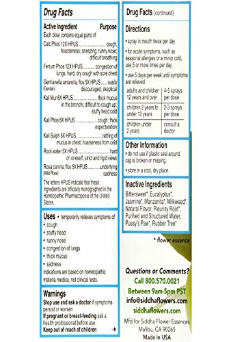 - 100% NATURAL: Using a unique formula of Cell Salts, Flower Essences including Bittersweet, Eucalyptus, Jasmine, Manzanita, Milkweed, Pleurisy Root, Pussy’s Paw, Rubber Tree our Natural Lung&Sinus Remedy harnesses nature’s healing properties to help with blockages relating to the lungs and sinuses. ACTIVE INGREDIENTS include CALC PHOS 12X: cough, hoarseness, sneezing, runny nose, difficult breathing. See label for all active ingredients, purposes and uses.