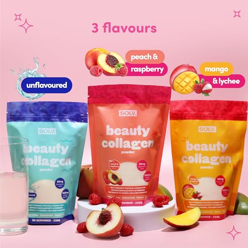 - COLD WATER SOLUBLE WITH NO LUMPS OR CLUMPS The SOLV. Beauty collagen powder easily dissolves in cold water without any lumps or clumps. It can also be added to smoothies, coffee, tea or yogurt to top up your daily collagen intake. It comes in three delicious flavours: peach and raspberry, mango and lychee, or unflavoured.