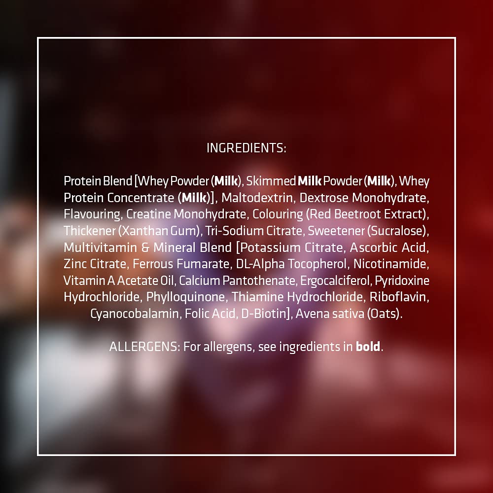 Protein Blend (Whey Powder (MILK), Skimmed Milk Powder (MILK), Whey Protein Concentrate (MILK), Maltodextrin, Dextrose Monohydrate, Flavouring, Creatine Monohydrate, Colouring (Red Beetroot Extract), Thickener (Xanthan Gum), Tri- Sodium Citrate, Sweetener (Sucralose), Multivitamin & Mineral Blend (Potassium Citrate, Ascorbic Acid, Zinc Citrate, Ferrous Fumarate, DL- Alpha Tocopherol, Nicotinamide, Vitamin A Acetate Oil, Calcium Pantothenate, Ergocalciferol, Pyriodoxine Hydrochloride, Phylloquinone, Thiamine Hydrochloride, Riboflavinm Cyanocobalaminm Folic Acid, D- Biotin), Avena Sativa (OATS).