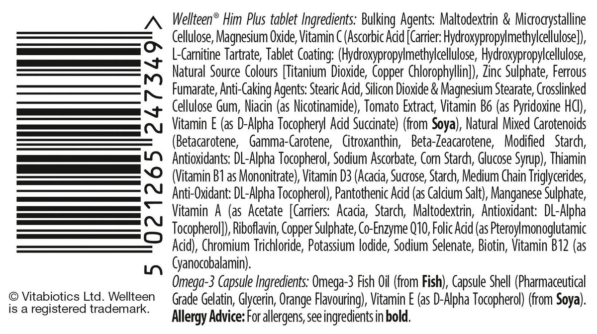 Advanced nutritional support for teenagers and young menToday's young adults have more to live up to than ever before, with busy social lives, late nights and early mornings, studying and sports to juggle. Ensuring a healthy, balanced diet is essential but it's not always a priority in a hectic teenage lifestyle. Wellteen Him Plus has been developed especially for teenagers and young men aged 13-19 years, it provides a comprehensive range of vitamins, minerals, Co-Q10, botanical extract Lycopene, plus a high purity Omega-3 capsule. Omega 3 provides DHA which helps to maintain normal brain function.*Teenagers and dietAn optimum nutritional intake during adolescence and young adulthood can help set the stage for lifelong health. Teenagers need to have sufficient vitamins and minerals to ensure healthy development during growth spurts, plus as they undergo significant physical and biochemical changes in their bodies, the necessity for nutrients greatly increases. The teenage years are perhaps the most significant in terms of hormonal change, and of course emotional stress.Brain and vision functionWellteen Him Plus provides Omega-3 EPA/DHA capsules. High concentration Omega-3 fish oil provides DHA* (Docosahexaenoic acid) which contributes to the maintenance of normal brain function and vision. Produced to the highest standards of quality control, using advanced molecular distillation for added purity. (High purity marine oil from Norway text and flag)Wellteen Him Plus tablets include zinc, iron and iodine which contribute to normal cognitive function, whilst pantothenic acid contributes to normal mental performance to help support concentration levels when studying. Iron also contributes to normal formation of red blood cells & haemoglobin and contributes to normal oxygen transport in the body to support cells and organs.Reduction of tiredness and fatigueJuggling studies, sports and a busy social life all takes its toll. Wellteen Him Plus includes vitamins B6, B12 and vitamin C which contribute to normal energy release and the reduction of tiredness and fatigue. Immune supportA range of nutrients including zinc, selenium, iron, folic acid, vitamins B6 & B12 and vitamin D contribute to the normal function of the immune system. Recent research has shown that optimum dietary levels of vitamin D may be higher than previously thought, Wellteen Him Plus provides an effective level of vitamin D with 800IU (20g) of the preferred D3 form. Vitamin C also contributes to normal immune system function during and after intense physical exercise which is a key consideration for those involved in sport. Bone healthHealth research shows that even a short period of very strict "dieting" during early teens can lead to low bone density, which causes weak bones in later life. Between 12-17 years of age, up to 90 percent of adult bone mass is laid down, so this is not a time to limit the intake of calcium or vitamin D which help to maintain normal bone health.Wellteen Him Plus tablets include vitamin D and minerals such as magnesium and zinc which contribute to the maintenance of normal bone health. Vitamin D also helps the body with the absorption and utilisation of calcium from the diet.