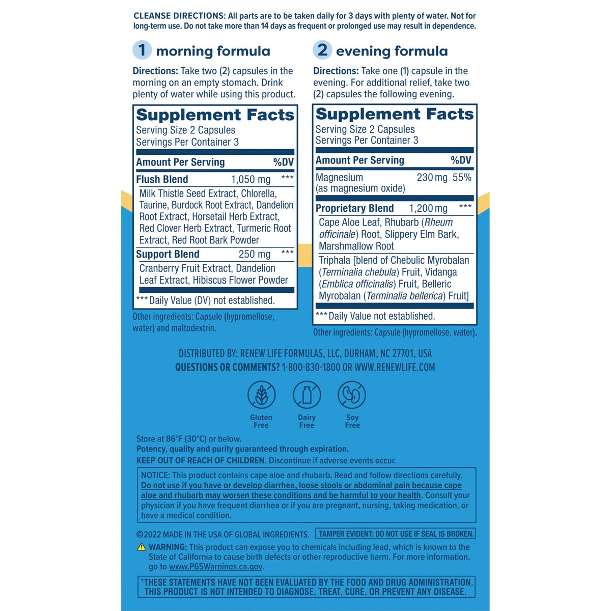 Details: Renew Life 3-Day Cleanse Total Body Reset Capsules are an easy-to-use, two-part herbal cleanse and detox formula that works in harmony with your body's natural detoxification process to help you feel lighter, brighter and more energized (1). This dietary supplement features an advanced herbal blend, cranberry and magnesium to help promote digestive wellness and gut health, support the healthy elimination of waste and toxins, reduce occasional bloating and water retention and promote regularity (1). Renew Life 3-Day Cleanse Total Body Reset vegetarian capsules are easy to take and guarantee potency, quality and purity through the expiration date. All parts of this detox cleanse are to be taken daily as directed for three days with plenty of water. In the morning, take two capsules on an empty stomach. In the evening, take one capsule with or without food. For additional relief, take two capsules the following evening. This digestive health supplement is gluten-free, dairy-free and soy-free. Renew Life puts health and wellness first with supplements that are backed by over 25 years of clinical trials. (1) These statements have not been evaluated by the Food and Drug Administration. This product is not intended to diagnose, treat, cure or prevent any disease.