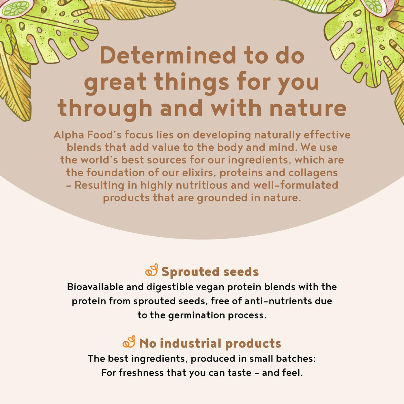 - 💚 DEVELOPED WITH HEART AND MIND: Our raw materials are the foundation and the heart of all Alpha Foods products, and the basis of complex, value-added elixirs, proteins and rituals, bottled in small batches. We develop and produce powerful plant-based foods and nutritional supplements, with clean ingredients to activate your body. Alpha Foods ship directly throughout Europe, without middlemen, to those who prioritise their health and that of their families, in a natural holistic way.