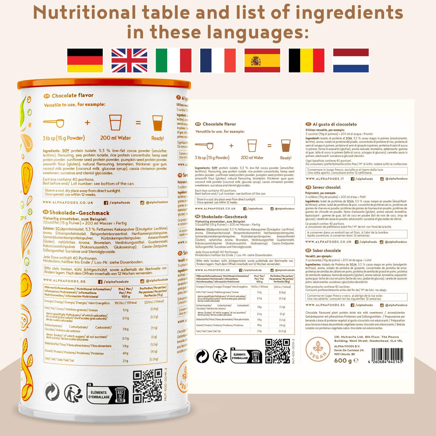 - 🍫 DELICIOUS FLAVOUR: A plant-based recipe with the familiar Alpha Foods quality. Creamy chocolate flavour refined with real cocoa and a pinch of the finest Ceylon cinnamon. The Alpha Foods vegan proteins are not only ideal for a perfectly balanced nutrition protein shake, but can also be used in a variety of baking and cooking.