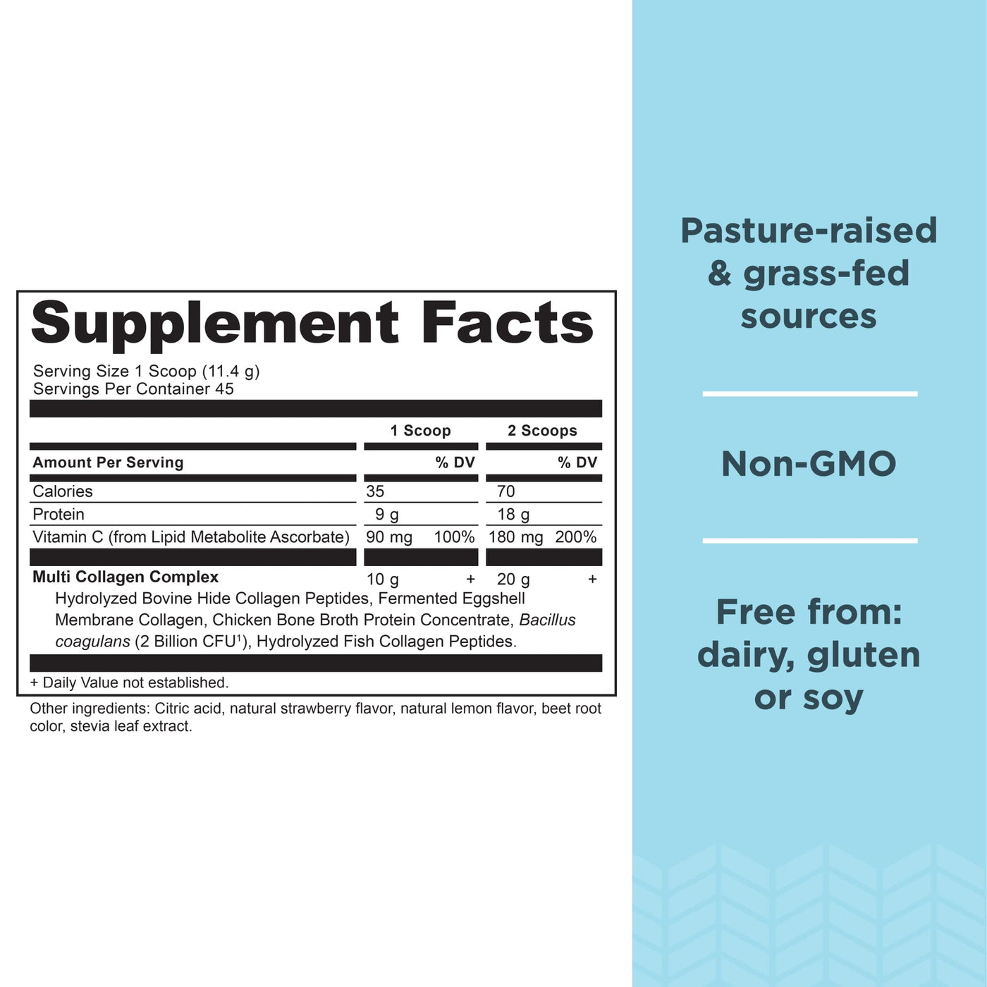 Details: Ancient Nutrition's Multi Collagen Protein Powder - Strawberry Lemonade delivers the perfect combination of sweet and tart. This drink is a great way to boost collagen intake! Collagen is a critical component in our bodies and research shows it helps support the health of our skin, joints and nails. It is essentially what holds our bodies together. As we age our collagen production naturally begins to slow and the signs of normal aging begin to appear. Adding hydrolyzed collagen to our daily routine can help provide benefits that are vital to our health and wellness. Multi Collagen Protein Powder Strawberry Lemonade features five collagen types, including I, II, III, V and X from four different sources. Our collagen is derived from chicken/eggs that are sourced exclusively from US farms in the Midwest, and bovine collagen from pasture-raised cows sourced from South America. With marine collagen derived from the skin of a variety of cold water fish, harvested in North America, our 100% wild-fish sourced collagen does not include shellfish and is free of antibiotics, growth hormones or other unwanted "dirty" chemicals that are often used in conventionally raised cattle and other livestock. One heaping scoop combined in 8 ounces of a favorite drink gives 9g of protein and 10.2g of multi collagen complex in 40 calories. Incorporate Multi Collagen Strawberry Lemonade into your diet and begin your health journey without the fuss and clutter of hard to swallow supplement pills. Enjoy a refreshing drink while receiving the benefits of increasing collagen intake.