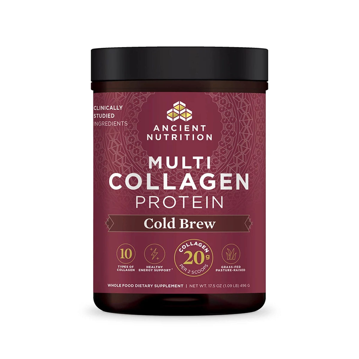 Details: Our new Multi Collagen Cold Brew is just the pick-me-up you've been looking for! With about half the caffeine of a regular cup of coffee (or tea), this cold brew collagen is the perfect way to start your day or to help you through that afternoon slump. Our unsweetened cold brew is filled with antioxidants and mixes easily with water or your milk of choice. A powerful energizing boost that won't leave you jittery! Ancient Nutrition Multi Collagen Protein Cold Brew powder (colageno hidrolizado en polvo) is an easy-to-digest, 5-type collagen mixing powder that can be added to any smoothie, shake, cold or warm drink and, can also be used in cooking or baking your favorite recipe! With a bold cold brew coffee flavor and approximately ⅓ the caffeine of a regular coffee, our newest collagen (colageno ) protein powder mixes into liquid with no chalky residue. Enjoy 9 grams of protein, 11.7 grams of collagen, 161 mg of caffeine and only 35 calories in every serving. Featuring five collagen types, including I, II, III, V and X from four different sources, our collagen is derived from chicken/eggs that are sourced exclusively from US farms in the Midwest, and bovine collagen (colageno hidrolizado) from grass-fed cows sourced from South America. With fish collagen derived from the skin of pollock cold water fish, harvested in North America, our 100% wild-fish sourced collagen does not include shellfish and is free of antibiotics, growth hormones or other unwanted "dirty" chemicals that are often used in conventionally raised cattle and other livestock. Start incorporating Ancient Nutrition Multi Collagen Protein Cold Brew powder (colageno hidrolizado powder) into your diet and begin your journey to a healthier, happier you without the fuss and clutter of hard to swallow supplement pills. Enjoy your coffee, baked goods, non-dairy or dairy milk, morning smoothie or pre/post-workout shake with a cold brew boost while receiving the benefits of a collagen and protein rich diet.