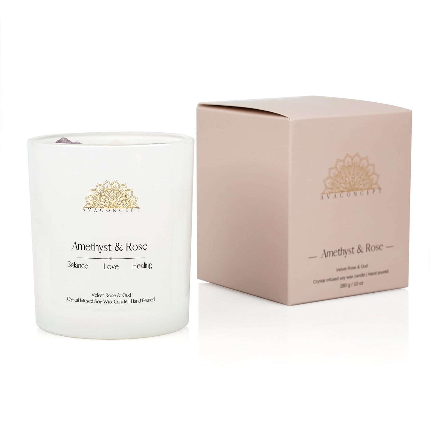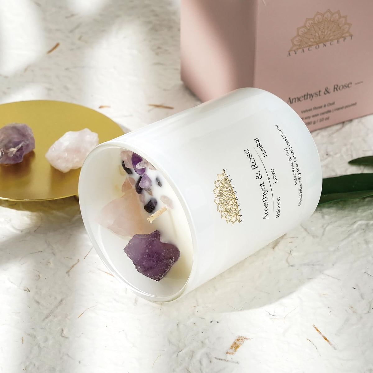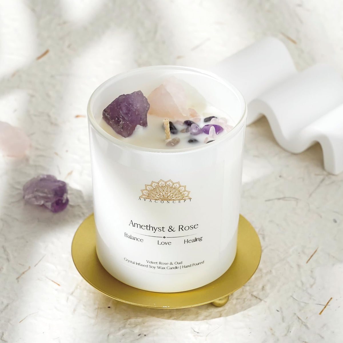Ava Concept Crystal Candles offer a premium quality hand-poured experience that combines natural crystals and high-quality fragrance oils. Each candle is thoughtfully crafted with a blend of two large, genuine, natural crystals such as Amethyst, Citrine, and Lazurite, and a combination of smaller polished crystals and clear quartz crystals. Our 10% scented candles are designed for an immersive experience, encased in a stunning 10-ounce high-quality frozen white jar. With a total burn time of 60 hours, these candles are perfect for any occasion, and can be used for crystal healing, wellness, and as gemstone candles. Lighting an Ava Concept Crystal Candle creates a peaceful and calming atmosphere, reducing stress and promoting self-care. The natural therapy of the crystals, combined with the therapeutic benefits of aromatherapy, helps focus your mind and body while bringing clarity to your thoughts and emotions. Transform any space with Ava Concept Crystal Candles, and experience the luxurious and immersive benefits of high-quality crystal candles, perfect for enhancing your well-being and relaxation