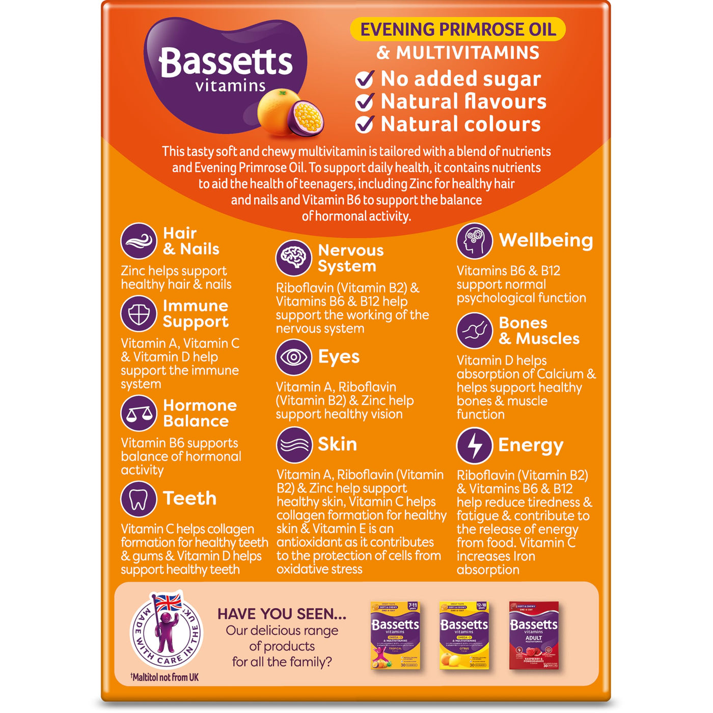 This tasty soft and chewy multivitamin is tailored with a blend of nutrients and evening primrose oil. To support daily health, It contains nutrients to aid the health of teenagers, including zinc for healthy hair and nails and vitamin B6 to support the balance of hormonal activity.
