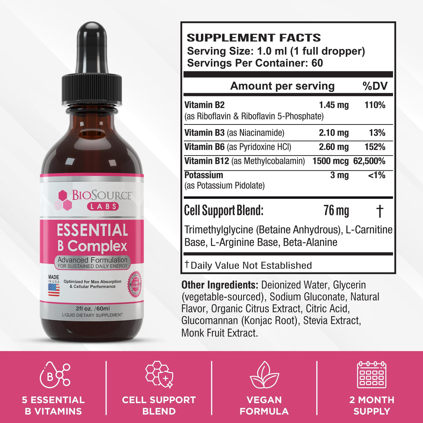 BioSource Labs Essential B Complex - Daily Vegan Vitamin B-Complex Sublingual Liquid