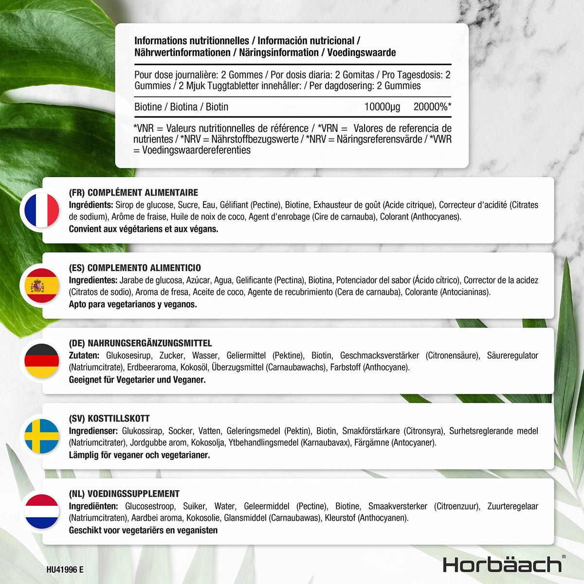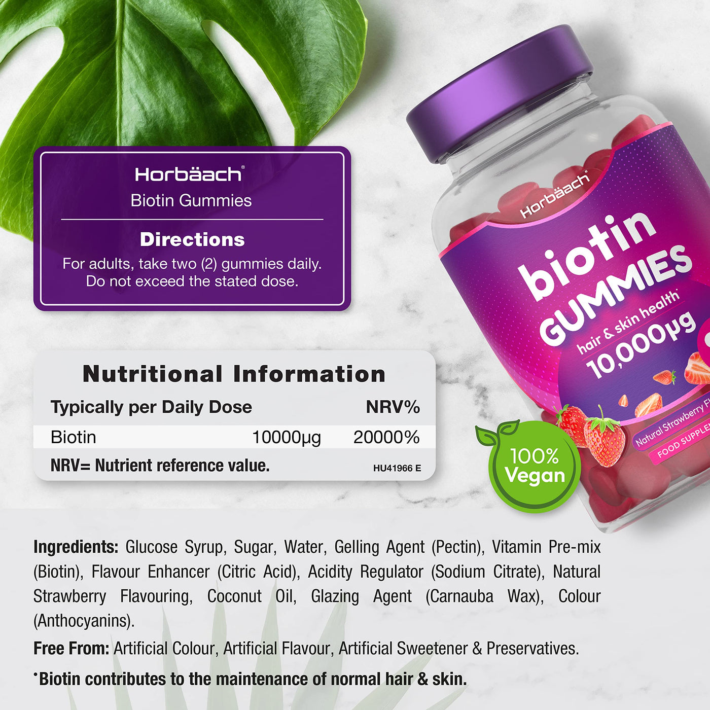 - SUITABLE FOR: Horbaach Biotin gummies are vegan and vegetarian friendly, as well as gluten free, milk & lactose free, yeast free, soy free and contains no artificial colours or preservatives, and are suitable for men & women.