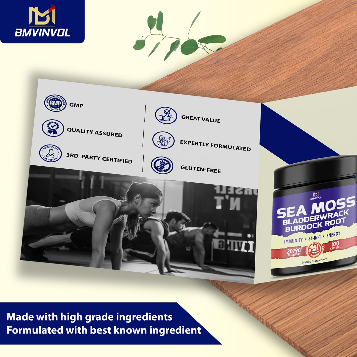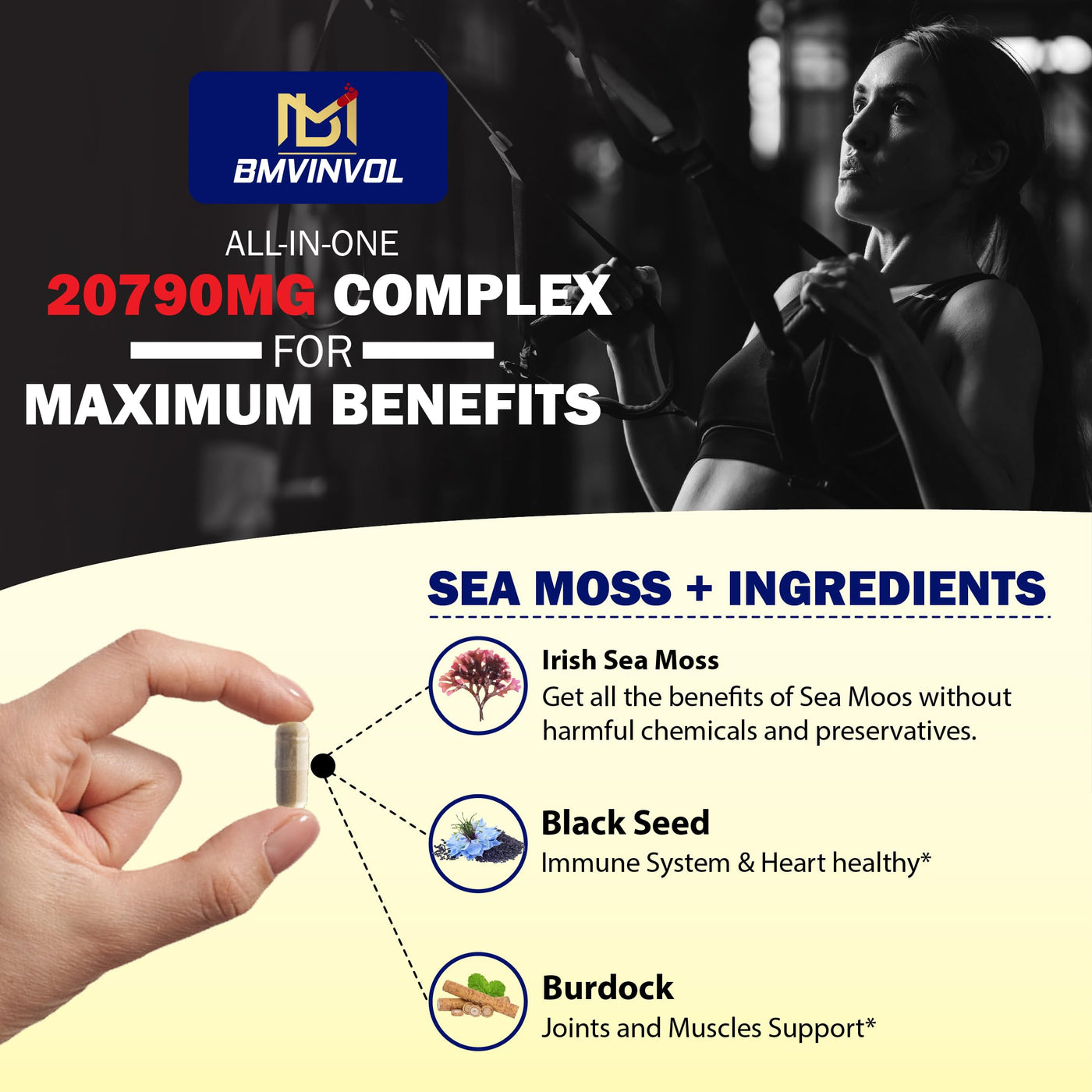 - ๐ช Perfect Combination: Our Irish Sea Moss capsule is infused with a concentrated blend of 34 natural ingredients including Vitamin C, Vitamin D3, Sea Moss Extract 30:1, Black Seed, Bladderwrack, Burdock, Ashwagandha, Black Pepper, 11 extracts from Immune Support Blend, and 15 ingredients of Advanced Cleansing complex.